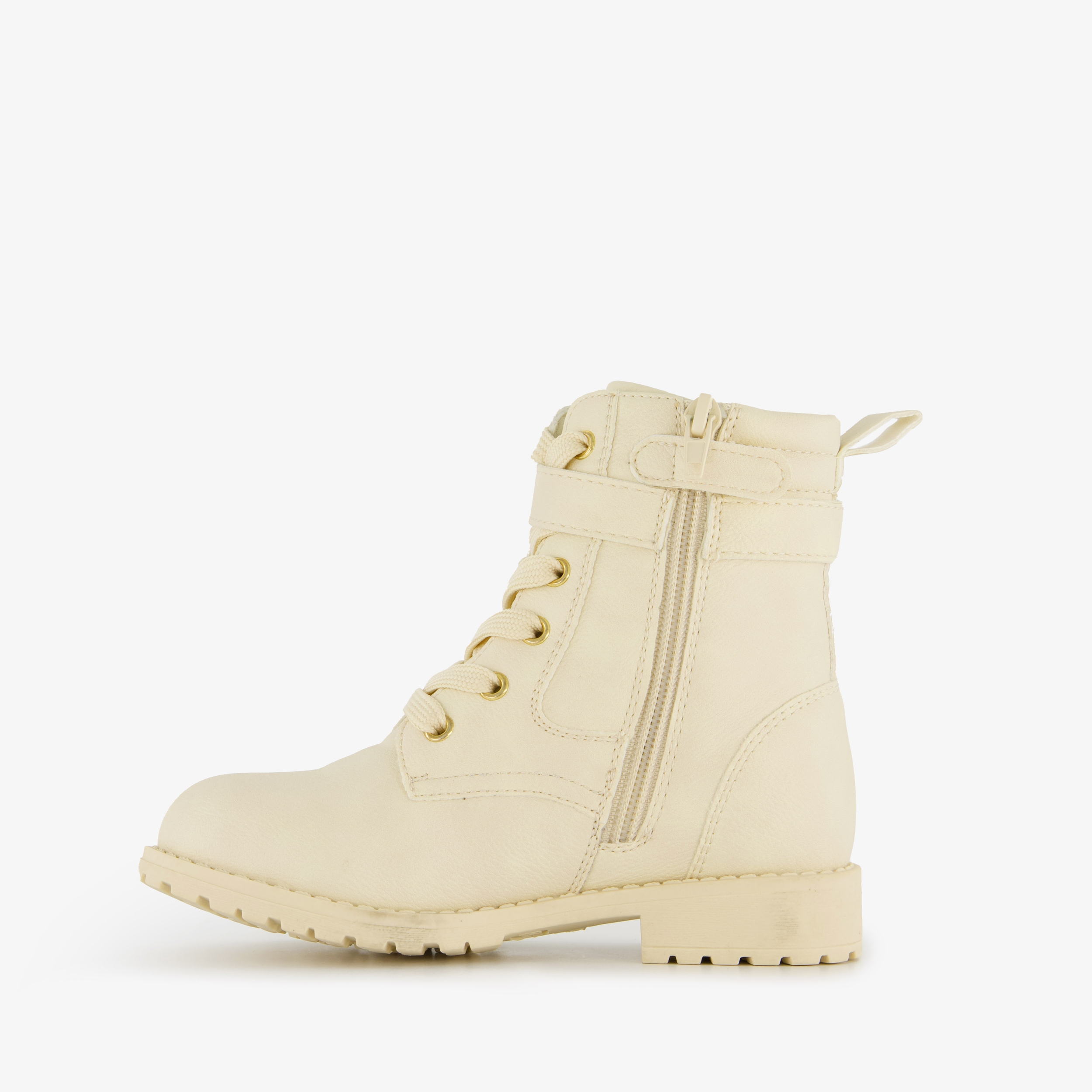 Beige veterboots voor meisjes van Blue Box. Gemaakt van imitatieleer, een binnenwerk van textiel en een rubberen zool. De boots hebben een vetersluiting en rits aan de binnenzijde voor een makkelijke instap. Het comfortabele voetbed is gemaakt van textiel. Deze is niet uitneembaar. Voorzien van een hiellusje en een bandje rondom de schoen met een klein tasje. De veterboots hebben een schachthoogte van 12 cm.