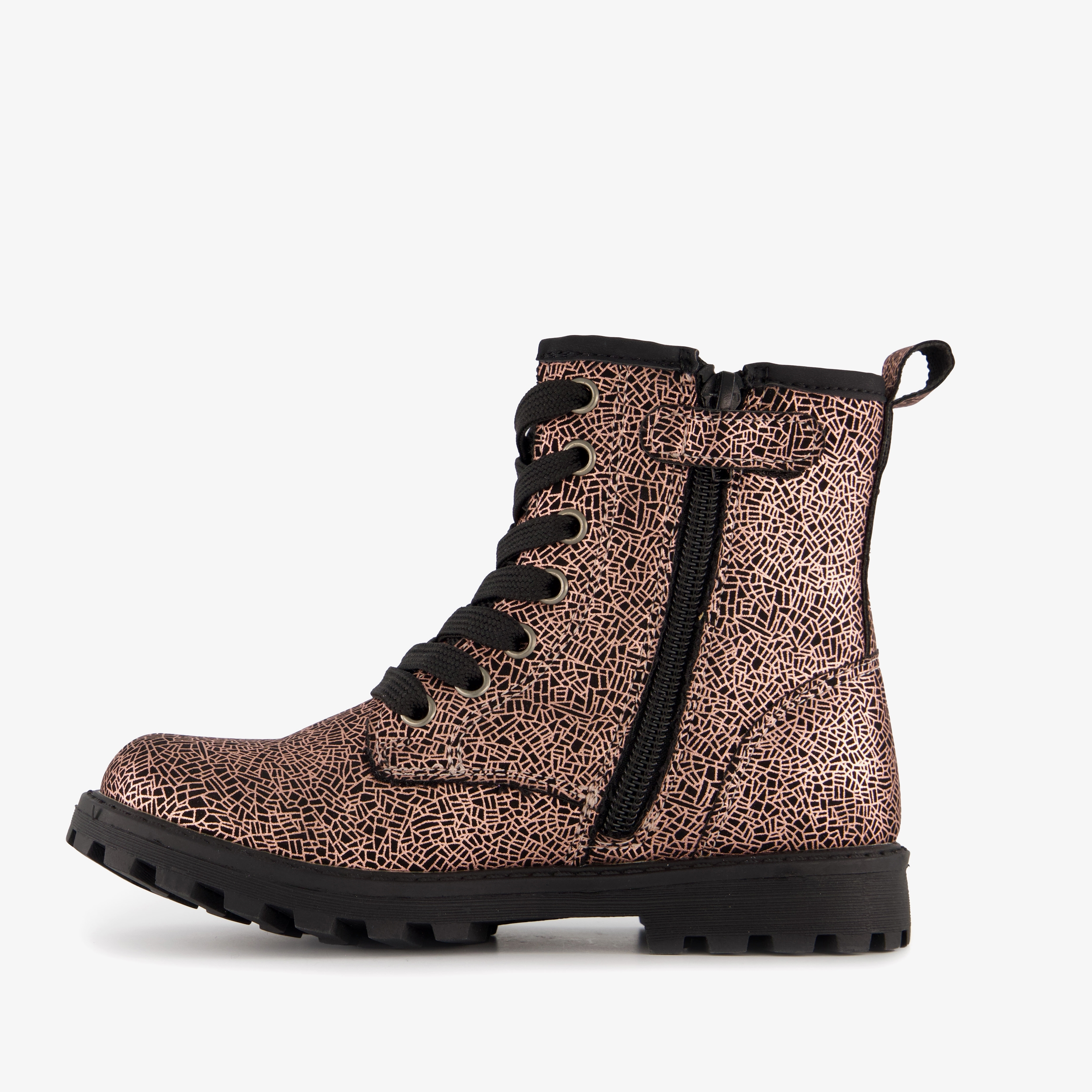Zwarte veterboots met metallic roze print voor meisjes van Blue Box. Het buitenwerk is gemaakt van imitatieleer, het binnenwerk van textiel en de stevige zool met profiel van rubber. Voorzien van een veter- en ritssluiting voor een fijne pasvorm en hiellusjes voor een makkelijke instap. Het vaste voetbed is gemaakt van synthetisch materiaal. Schachthoogte is 11 cm.