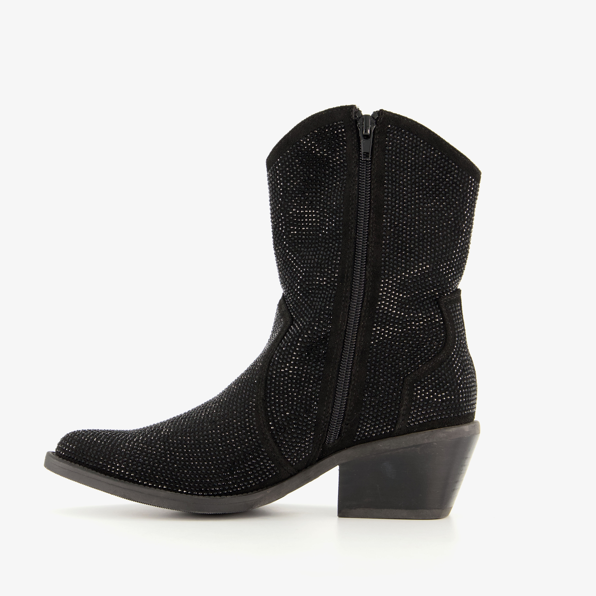 Zwarte western laarsjes voor dames. Met een boven- en binnenwerk van imitatieleer en een rubberen zool. De laarsjes hebben een ritssluiting aan de binnenkant en een comfortabel voetbed van imitatieleer. Voorzien van strass steentjes op het bovenwerk en een schachthoogte van 19 cm. De western laarsjes hebben een blokhak van circa 3 cm.