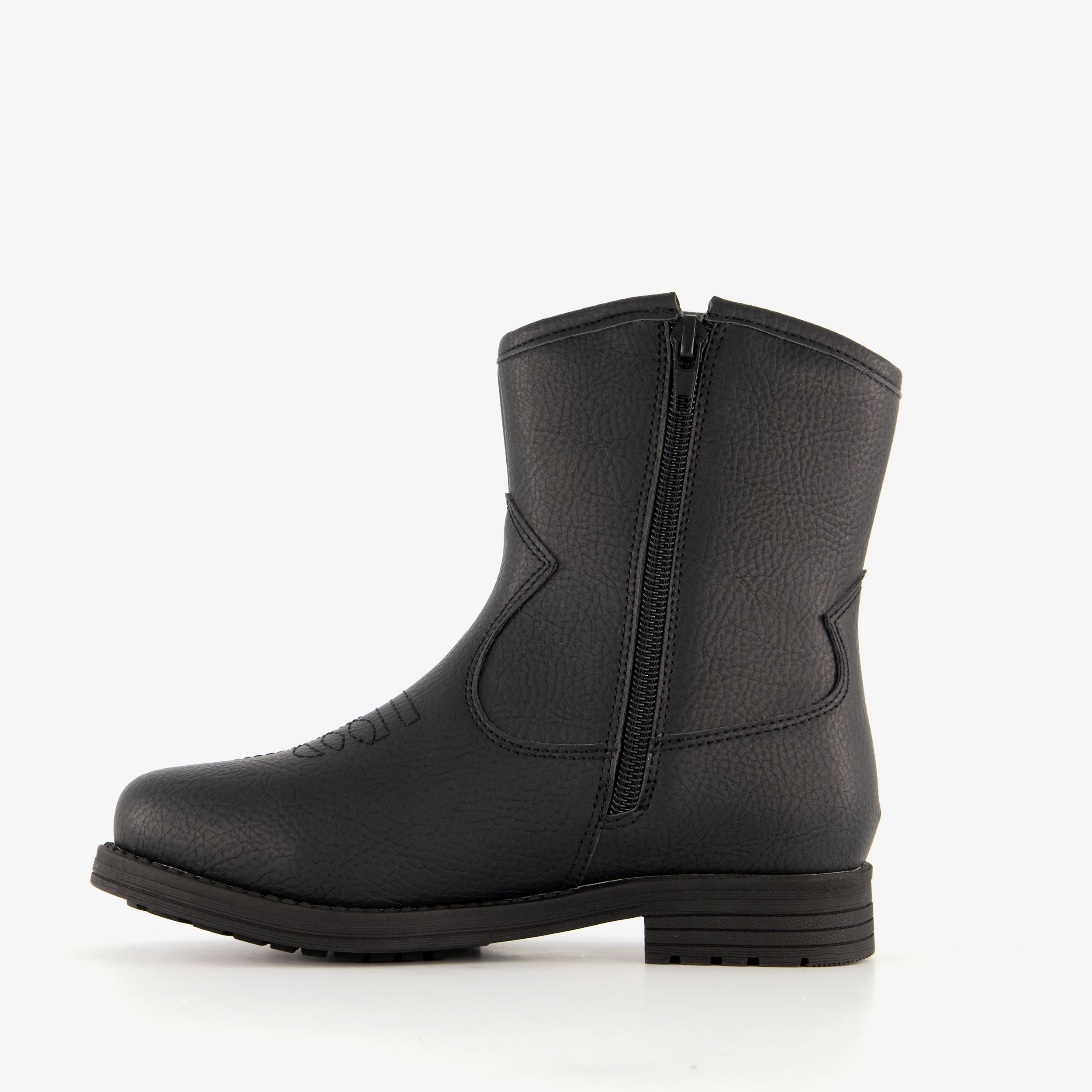 Zwarte western boots voor meisjes uit de Blue Box collectie. Gemaakt van imitatieleer met een binnenwerk van textiel en een stevige profielzool van rubber. Voorzien van een rits aan de binnenzijde en aantreklusjes aan de bovenzijde. De laarsjes zijn deels gevoerd en hebben geborduurde details op de wreef. Het comfortabele voetbed van textiel is niet uitneembaar. Schachthoogte is 13 cm.
