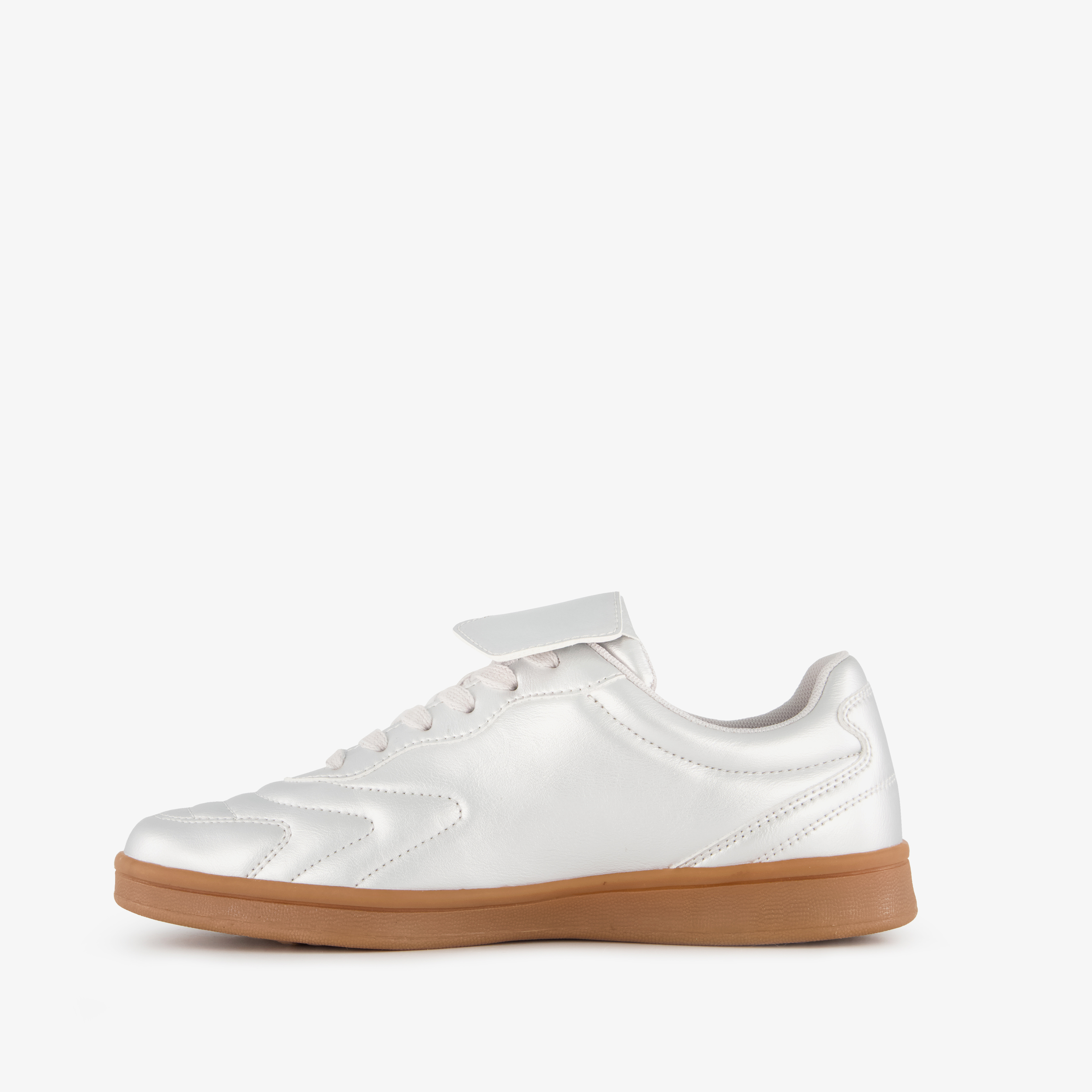 Lage, zilveren sneakers voor dames van Blue Box met witte details. Gemaakt van imitatieleer, een binnenwerk van textiel en een rubberen zool. De zool is uitneembaar. De sneakers hebben een vetersluiting en comfortabel voetbed van textiel.