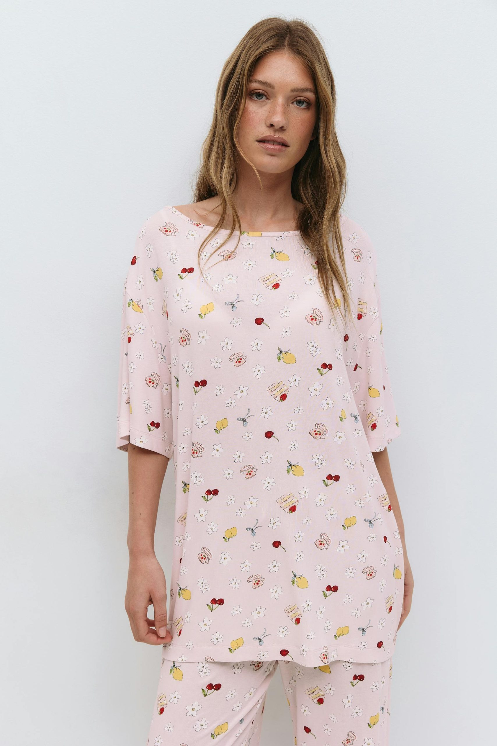 T-shirt met patroon met citroenen, kersen en bloemen. Het t-shirt is roze en heeft brede mouwen. Het heeft boot halslijn, ruimere pasvorm en een voering.