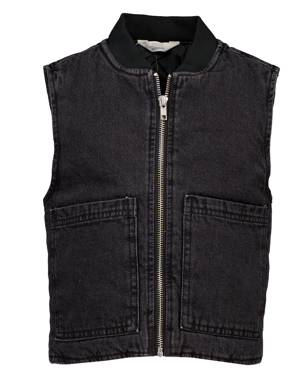Deze zwarte bodywarmer is gemaakt van denim en heeft een stoere uitstraling. De bodywarmer sluit met een zichtbare ritssluiting en is voorzien van twee grote opgestikte zakken aan de voorkant, handig voor het bewaren van kleine spullen. De kraag is ribgebreid voor extra comfort in de nek. Dankzij de katoenen buitenkant en polyester voering en vulling voelt het vest stevig aan.