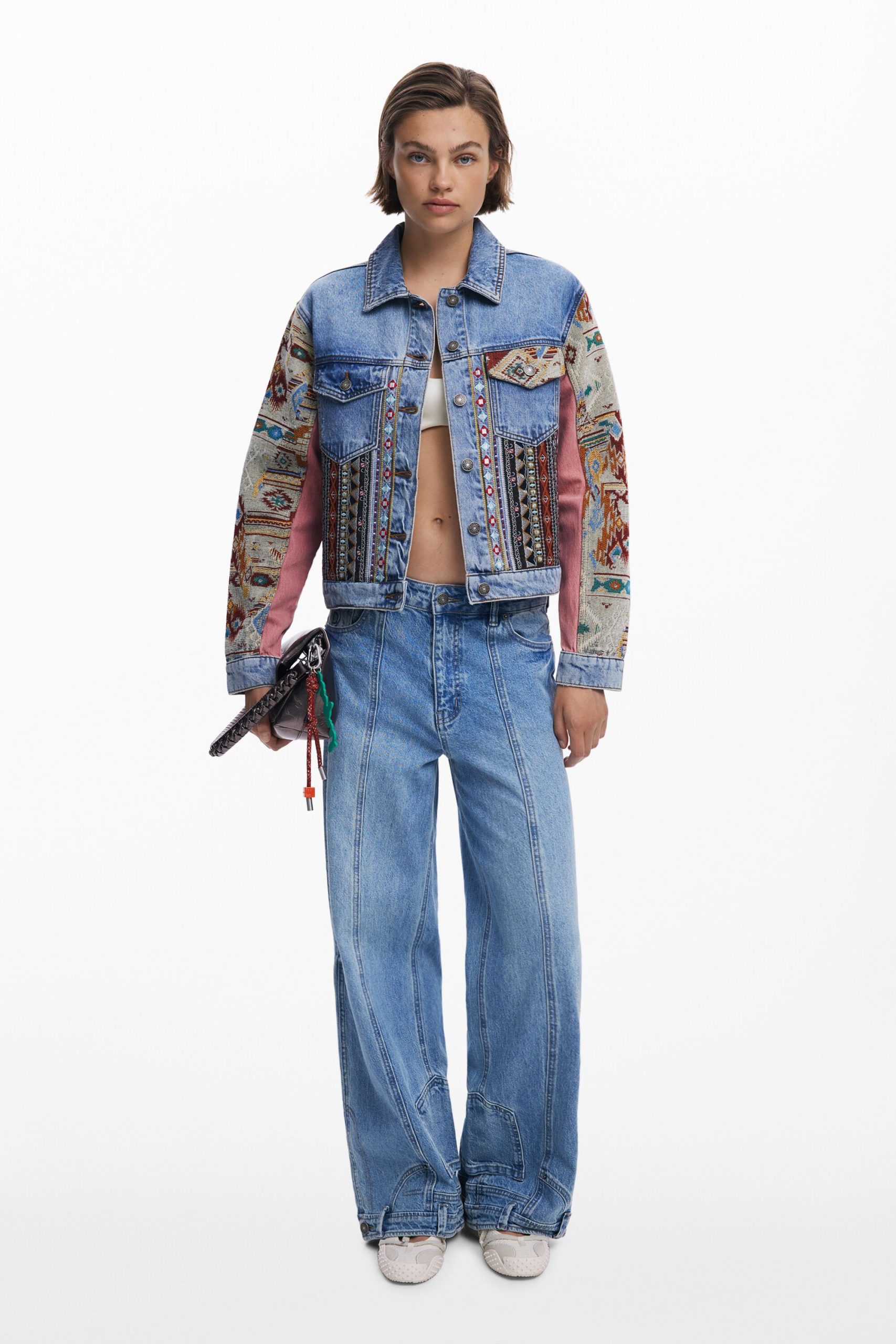 Trucker-spijkerjack met een combinatie van stoffen en boheemse geïnspireerde borduursels.