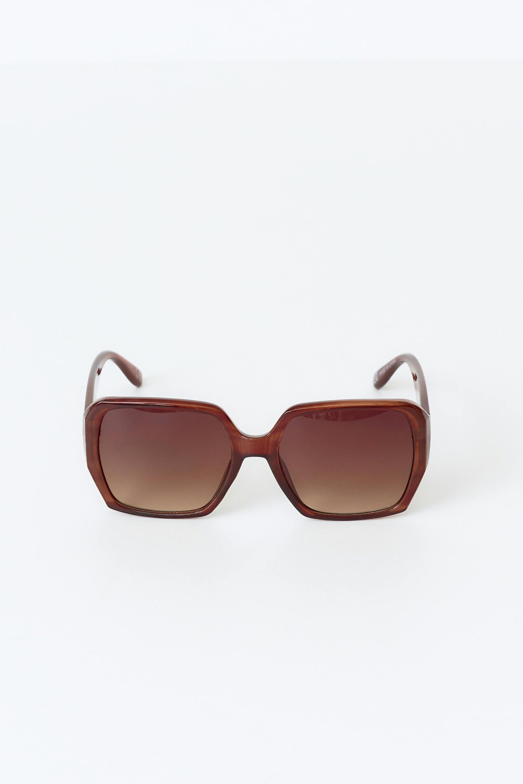 Vierkante zonnebril met stevige plastieken kaders. De zonnebril is bruin en heeft overmaatse pasvorm. Het heeft gevormde Neuskussens en getinte glazen met UV400-bescherming.
