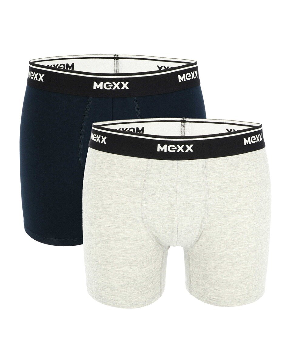 Een set van twee comfortabele Mexx boxers in de kleuren Donkerblauw en Gemeleerd grijs. De boxers hebben een band met Mexx logo.