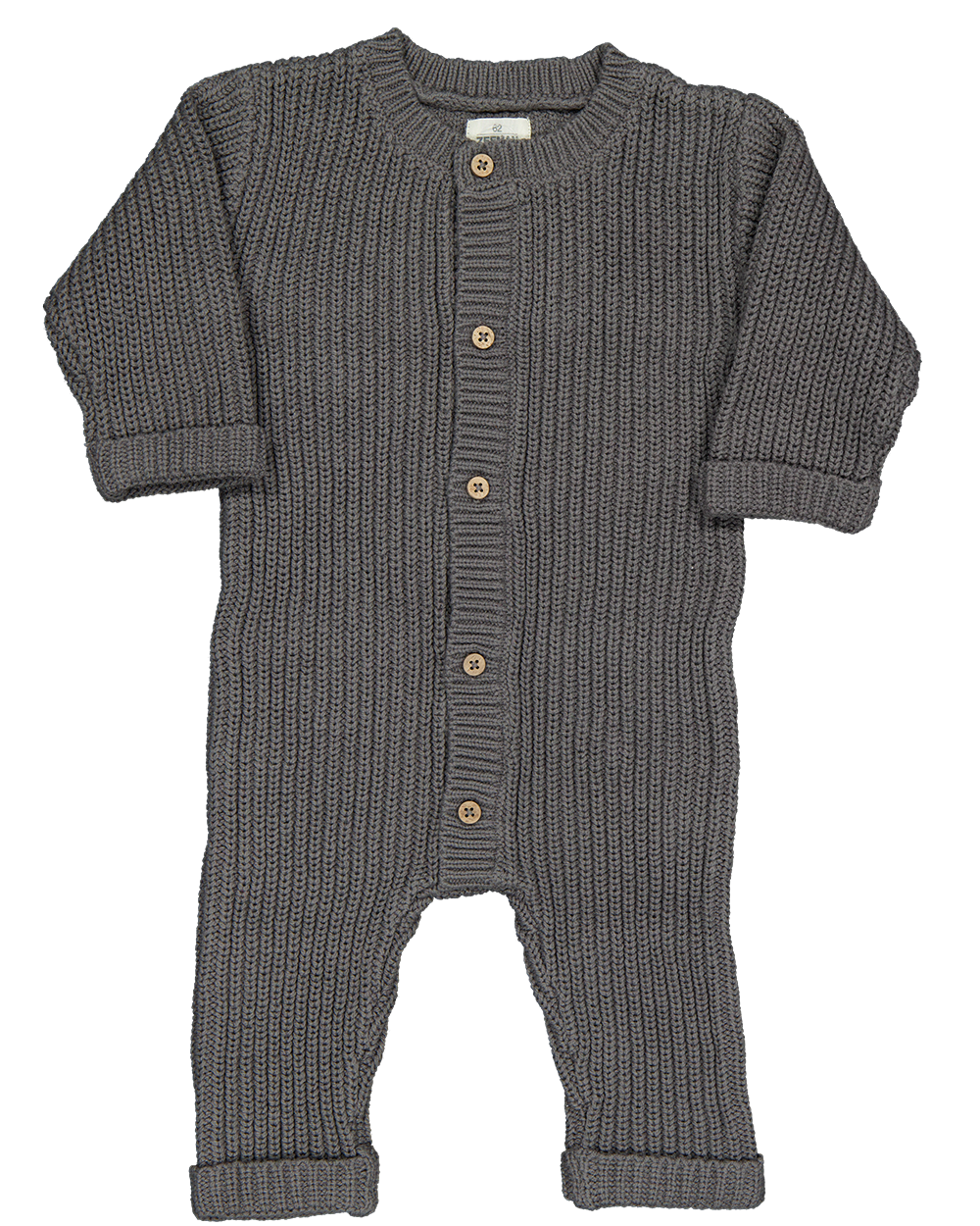 Dit gebreide grijze boxpakje voor baby's heeft lange mouwen. De stof bestaat uit katoen en acryl, waardoor hij zacht aanvoelt en prettig zit. De houten knoopjes aan de voorkant maken het aan- en uitkleden makkelijk. De boorden bij de mouwen en broekspijpen zijn geribd, zodat alles goed op zijn plek blijft.