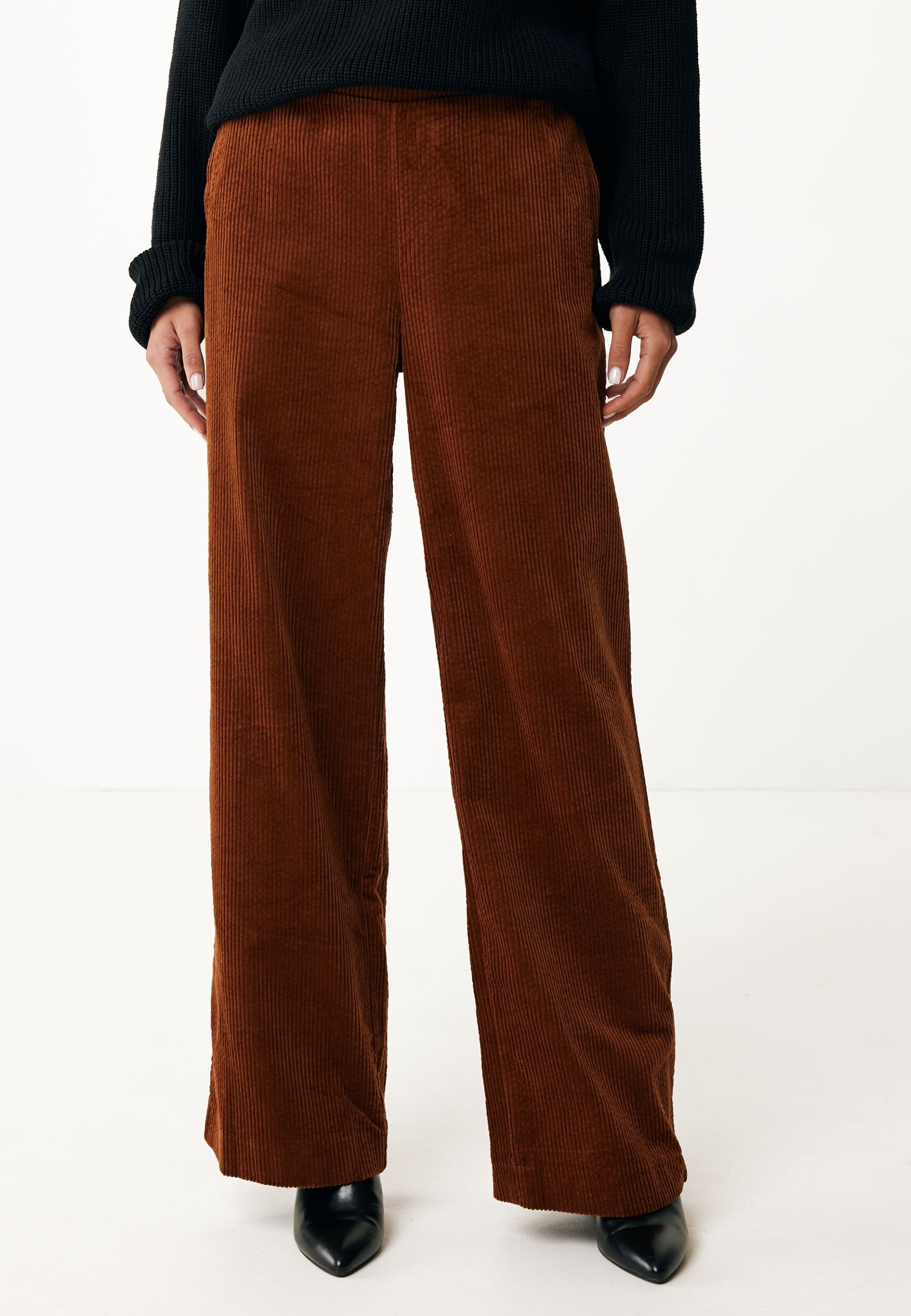 Deze corduroy broek in roodbruin is vervaardigd van comfortabel katoen en biedt een stijlvolle uitstraling. De elastische tailleband zorgt voor een prettige pasvorm, terwijl de wijde pijpen een moderne touch toevoegen. Perfect voor zowel casual als meer formele gelegenheden, deze broek is eenvoudig te combineren met diverse tops. Draag hem met een donkere coltrui en een stijlvolle blazer voor een tijdloze look. Bekijk meer keuzes in onze damescollectie opMexx Dameskleding.