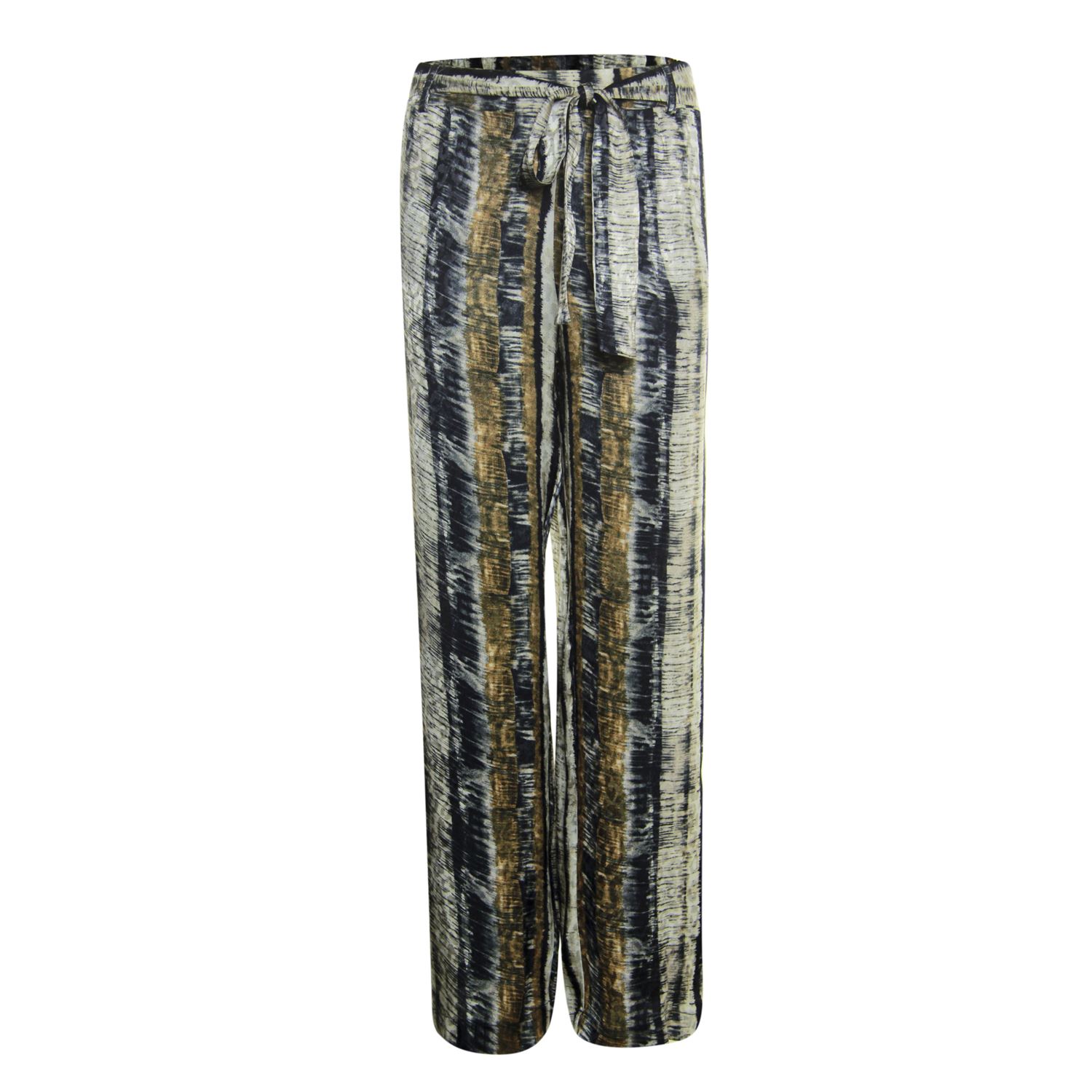 Palazzo broek in mooie bedrukte of uni stof. De broek heeft een rechte pasvorm met wijde pijp en een strikceintuur aan de tailleband.