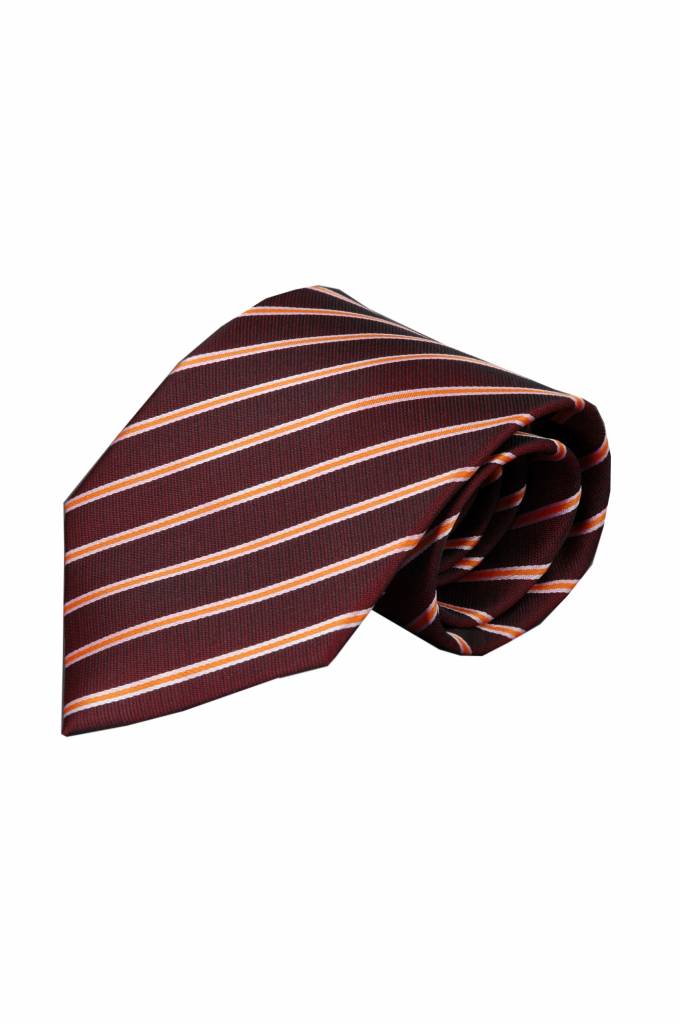 Bruine stropdas, oranje en wit gestreept v. Italiaanse zijde. Vanbinnen dezelfde stof, ook het lusje! Afgewerkt m. zadelsteek! Shop online bij Italian Design!