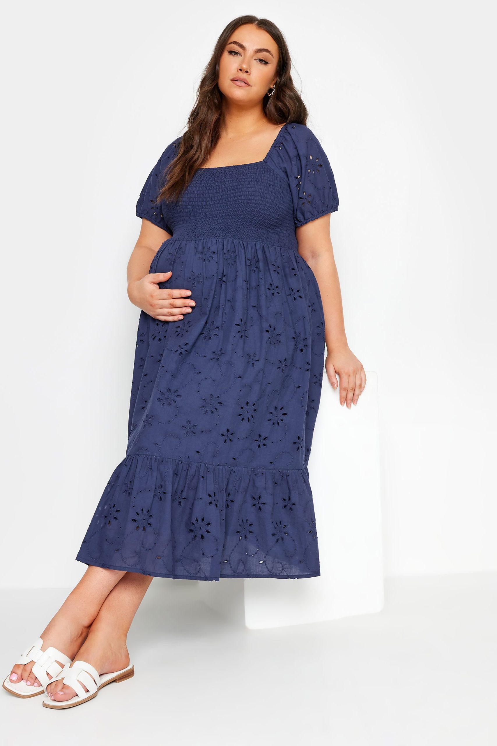 Bump It Up Maternity Midijurk Van Broderie Met Korte Mouwen En Smokwerk In Donkerblauw Size 58-60