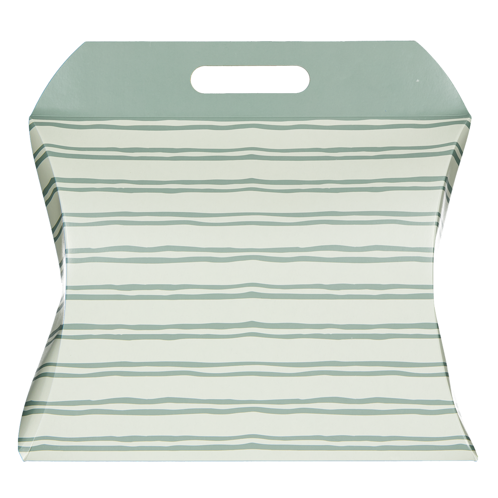 Deze cadeaudoos is gemaakt van licht papier en heeft een groene kleur met een patroon van horizontale strepen. Door het stevige materiaal is hij geschikt om een cadeau goed in te pakken. Het handvat aan de bovenkant maakt het makkelijk om de doos te dragen en mee te nemen. Handig voor het geven van een verrassing.