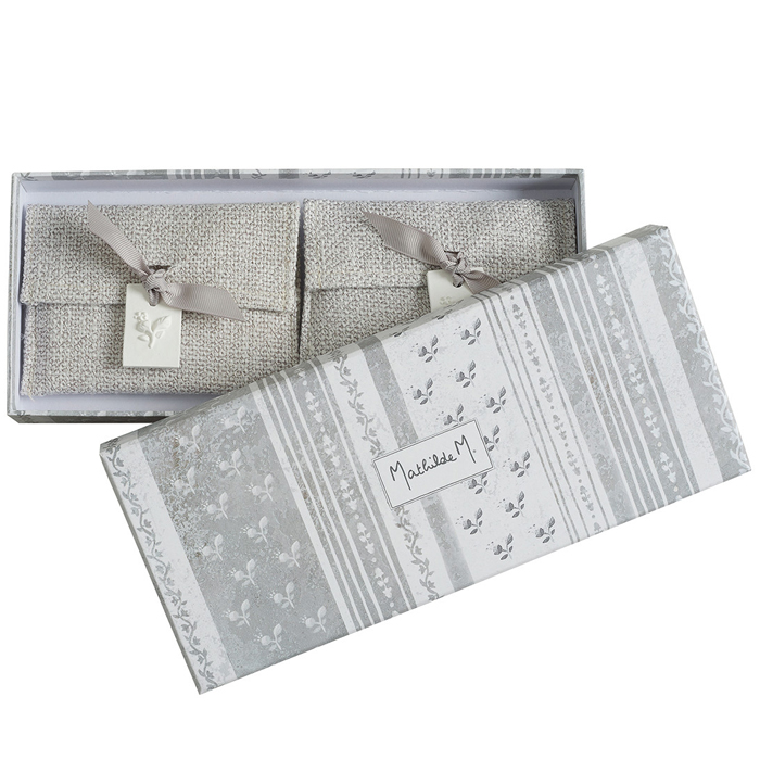 Cadeaudoosje met twee geurzakjes uit de Palazzo Bello collectie van Mathilde M. De zakjes zijn geparfumeerd met Fleur de Coton, een zachte en omhullende katoenbloemgeur die ontstaat uit de combinatie van witte bloemen, katoen en kostbare houtsoorten. Gebruik de geurzakjes voor het subtiel parfumeren van je kledingkast, je koffer of je lades. Wanneer de geur van de zakjes minder wordt, schudt ze dan even flink op om de geur nieuw leven in te blazen. De linnenlook zakjes zijn gemaakt van polyester en hebben een afmeting van 12 x 8,9 cm.