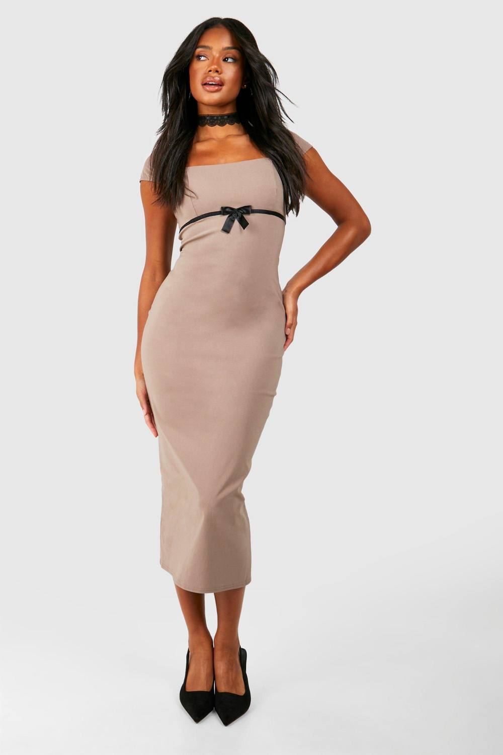 Heb je plannen? Blijf feestklaar met deze stoere, vormgevende bodycon-jurk. Een figuurslankende stijl gemaakt van een rekbaar materiaal dat je rondingen op precies de juiste plekken omarmt, deze aansluitende bodycon-jurk is de perfecte keuze om dat onberispelijke silhouet te bereiken. Van date night tot meidenavond, een strakke jurk is de essentiele must-have in elke garderobe die elke vrouw nodig heeft. Zet de show in een zwarte bodycon-jurk of kies voor gedurfde prints en maak je klaar om herinnerd te worden. Combineer hem met opvallende oorbellen en killer heels… geregeld. Stijl: Bodycon-jurk Stof: Bengaline Lengte: Midaxi Halslijn: Vierkant Mouwlengte: Cap Sleeve Lengte model: 168 cm / 5’6″ boohoo Dames Cap Sleeve Bengaline Bow Detail Midaxi-jurk | Taupe | Maat: 40