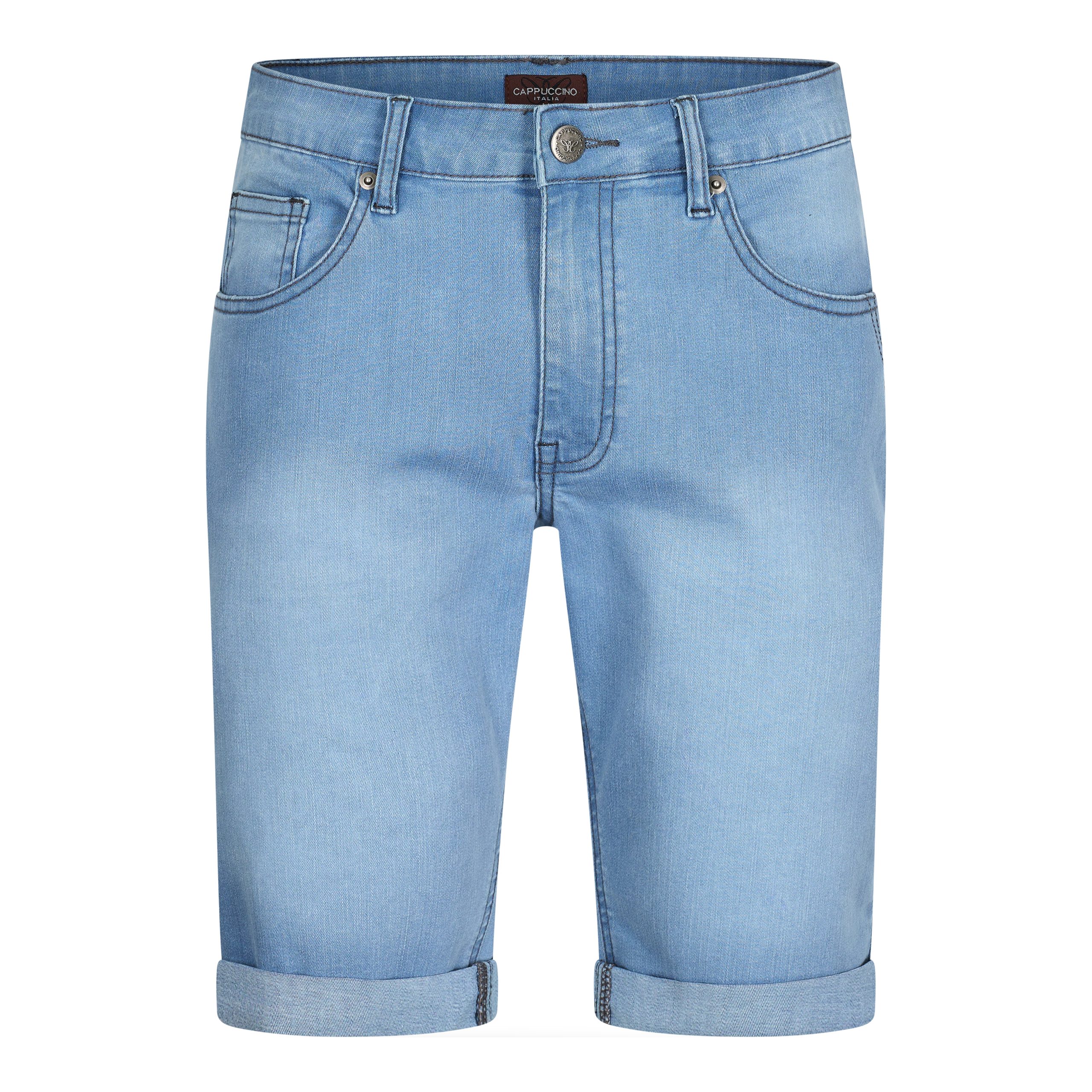 Cappuccino Italia denim short voor heren. De short is gemaakt van katoen en elastaan, en heeft een normale pasvorm. De elastaan zorgt voor een lekkere rek in de stof. De short heeft 2 steekzakken en 2 kontzakken.