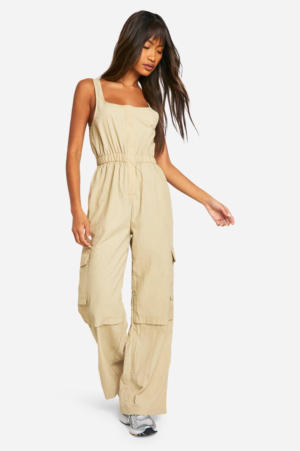 Veelzijdige cargo utility-jumpsuit met een reguliere pasvorm Vierkante halslijn voor een moderne, flatterende uitstraling Functionele zij-cargozakken voor extra functionaliteit Wijd uitlopende pijpen voor comfort en stijl Mouwloos silhouet, perfect om in laagjes te dragen Omarm moeiteloze stijl met deze cargo utility-jumpsuit, een onmisbare aanvulling op je casual garderobe. De vierkante halslijn geeft een eigentijdse touch, terwijl het wijde pijpodontwerp de hele dag voor comfort zorgt. Combineer het met sneakers voor een relaxte look, of draag het met sandalen met hakken voor informele bijeenkomsten. Draag er een cropped jas of vest bij voor koelere dagen. De zij-cargozakken bieden functionaliteit zonder concessies te doen aan de stijl. Perfect voor gezinsuitstapjes, weekendbrunches of informele winkeltrips, en je kunt het stylen met een opvallende riem om je taille te accentueren. Voor een trendy twist combineer je het met een baseballpet en een oversized tote, zoals te zien is op ons model. Dit veelzijdige kledingstuk zal zeker een favoriet worden in je collectie en biedt zowel comfort als stijl voor diverse casual gelegenheden. boohoo Dames Cargo Geweven Utility Scoop Jumpsuit | Stone | Maat: 42