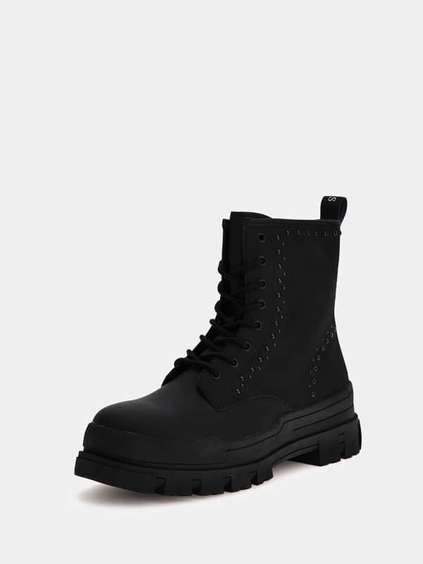 Korte laarzen in nepleer.Ronde neus.Sluiting met veters.Legerkistmodel.Studapplicatie.Samenstelling bovenkant: 60% Echt leer 40% Polyurethaan.Inlegzool en binnenvoering in stof.Zool in thermoplastisch rubber.