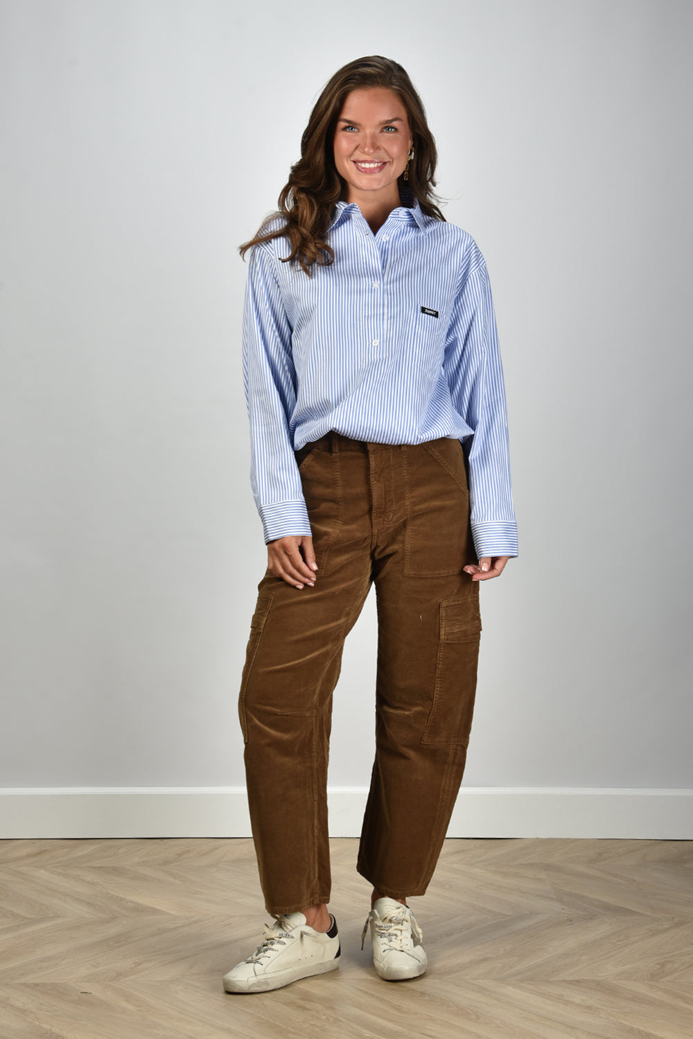 De Citizens of Humanity Marcelle Low Slung Cargo broek in de kleur manuka is uitgevoerd in zachte corduroy en heeft een cropped model met het kenmerkende low slung silhouet. Deze cargo broek heeft praktische zakken aan de zijkant die de functionele uitstraling versterken zonder zwaar te wirken. Door het ribstructuur van het corduroy krijgt de pantalon een subtiele textuur die goed werkt bij zowel casual als nettere looks. Combineer de broek met een aansluitende trui voor een gestroomlijnd silhouet of juist met een oversized blazer voor contrast. Marjon stylet deze broek af met een aansluitende trui en een paar hoge laarzen voor een moderne en draagbare look. Voor de verzorging geldt dat je het wasvoorschrift op het label raadpleegt; corduroy heeft meestal baat bij een zachte wasbeurt en binnenstebuiten keren om de vezelstructuur te behouden. Bekijk meer vergelijkbare items in de broeken collectie.
