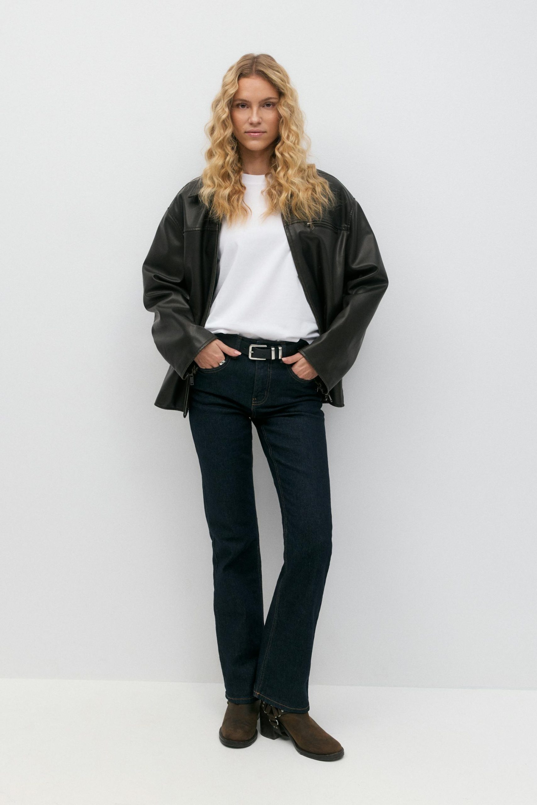 Spijkerbroek met rechte pijpen de knieën en lager. De spijkerbroek is donkerblauw en heeft normale pasvorm. Het heeft midden taille, rek, gulp en zakken aan de voor- en achterzijde. Gebruik onze maattabel om je maat te vinden.