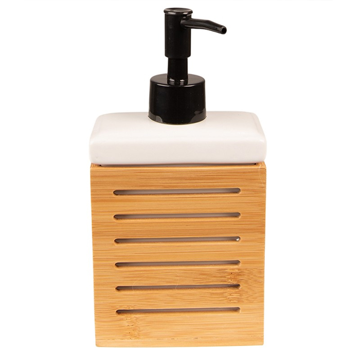 Dit zeeppompje van Clayre&Eef is gemaakt van wit keramiek gecombineerd met bamboe accenten. Het pompje heeft een strak en modern ontwerp dat naadloos past in elke interieurstijl. Het keramische gedeelte van het zeeppompje zorgt voor duurzaamheid en een luxe uitstraling, terwijl het bamboe-element een natuurlijk en warm tintje toevoegt. Met zijn gebruiksvriendelijke pompmechanisme kun je eenvoudig de gewenste hoeveelheid vloeibare zeep of lotion doseren. Dit zeeppompje combineert functionaliteit met stijl en voegt een vleugje verfijning toe aan je badkamer, keuken of toilet. Combineer de Clayre&Eef zeepdispenser naar wens met de bijpassende accessoires voor een complete set.Afmeting: 10 x 6 x 19 cm