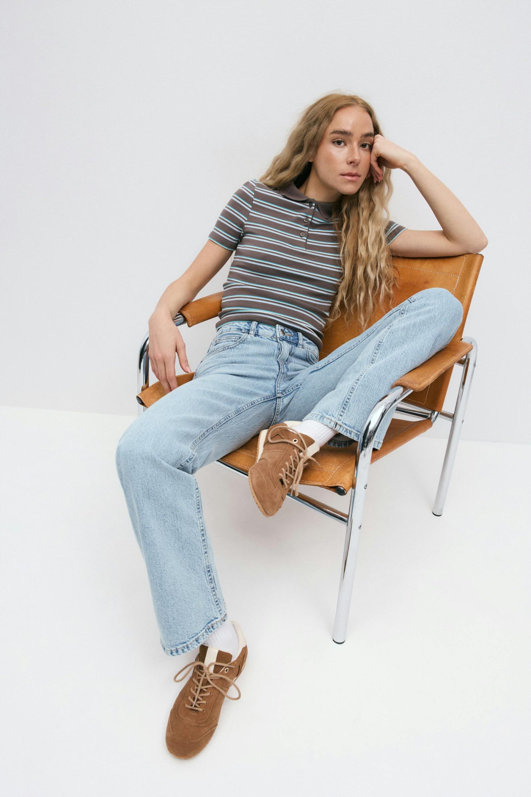 Gestreepte poloshirt met kraag. De poloshirt is bruin, blauw en met korte mouwen en heeft v-hals. Het heeft knoppen aan de bovenkant, elastische kwaliteit en normale pasvorm.