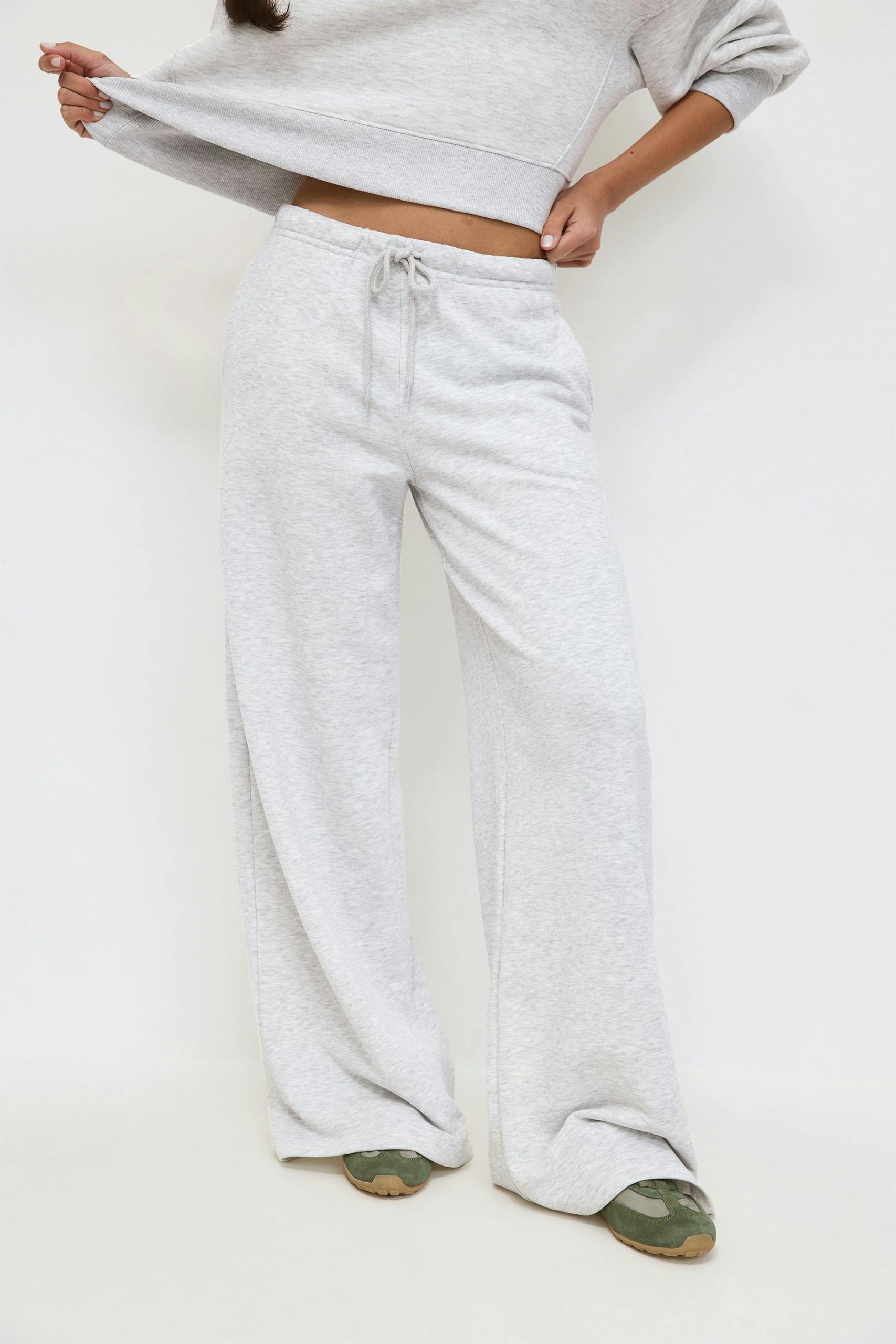 Joggingbroeken met een lage taille en brede broekspijpen. De broeken zijn grijs en hebben zakken in de zijden. Het heeft zelfbinder aan de voorkant, zachte elastiek aan de taille en normale pasvorm.