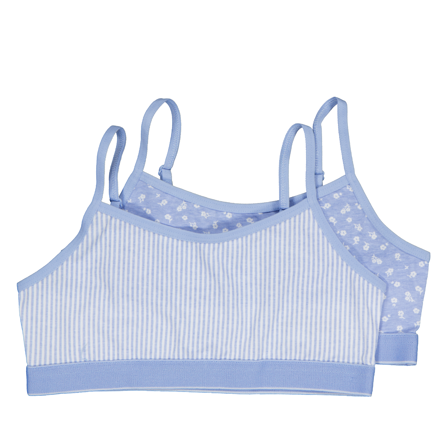 Deze croptops zijn gemaakt voor jongens en meisjes. In de set zitten twee varianten: één met een smal streeppatroon en één met een dessin van kleine bloemetjes, beide in wit en lichtblauw. De tops hebben verstelbare schouderbandjes en een zachte, elastische band aan de onderzijde. Dankzij het katoen met polyester en elastaan dragen ze comfortabel en sluiten ze goed aan op het lichaam.