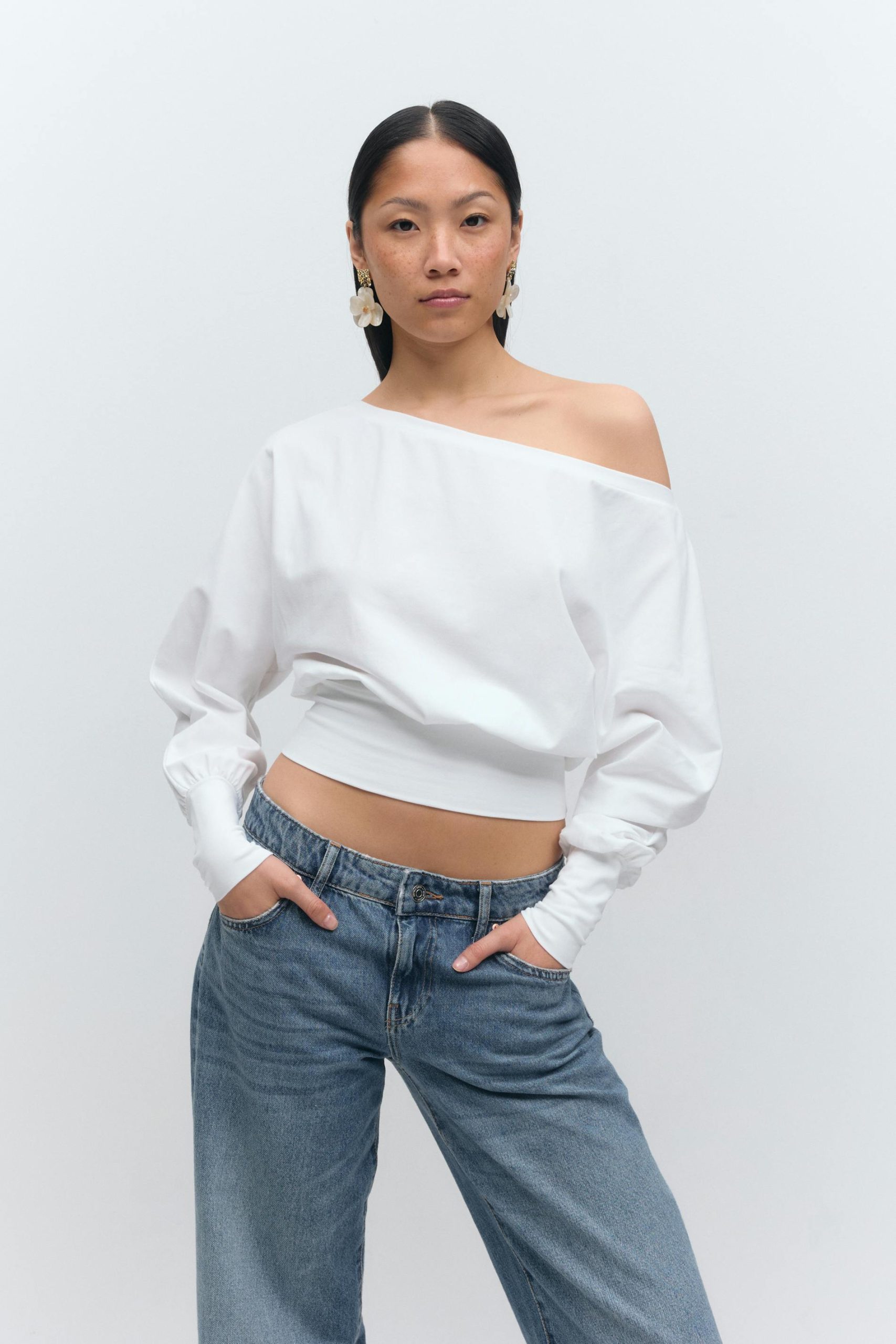Off shoulder topje met lange mouwen met een normale pasvorm. Het topje is wit en heeft een elastiek aan de uiteinden van de mouwen en aan de taille.