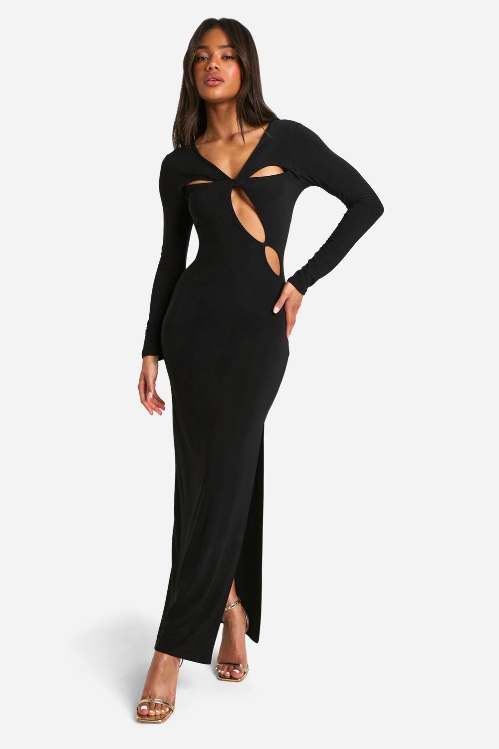 Opvallend uitgesneden design met twistdetail Aansluitende slinky stof Verleidelijke V-hals Lange mouwen voor veelzijdige styling Gedurfde zij-split ter hoogte van het dijbeen Maak een blijvende indruk met deze showstopper onder de maxi-jurken. Het in het oog springende uitgesneden design en twistdetail creeren een fascinerend silhouet, perfect voor die avonden waarop je alle aandacht wilt trekken. De slinky stof omhelst je rondingen op precies de juiste plaatsen, terwijl de dijhoge zij-split een vleugje drama aan je ensemble toevoegt. Combineer met bandjeshakken in metallic tint en opvallende oorbellen voor een avondje uit. Voor een meer verfijnde uitstraling gooi je er een strak blazer overheen en ruil je de hakken in voor puntige pumps. Of je nu de dansvloer op gaat of cocktails drinkt met vrienden, deze jurk zorgt ervoor dat je de hele avond in het middelpunt van de belangstelling staat. boohoo Dames Cut Out Twist Detail Slinky Long Sleeve Maxi Dress wordt: Uitgesneden twistdetail slinky maxi-jurk met lange mouwen | Black | Maat: 46