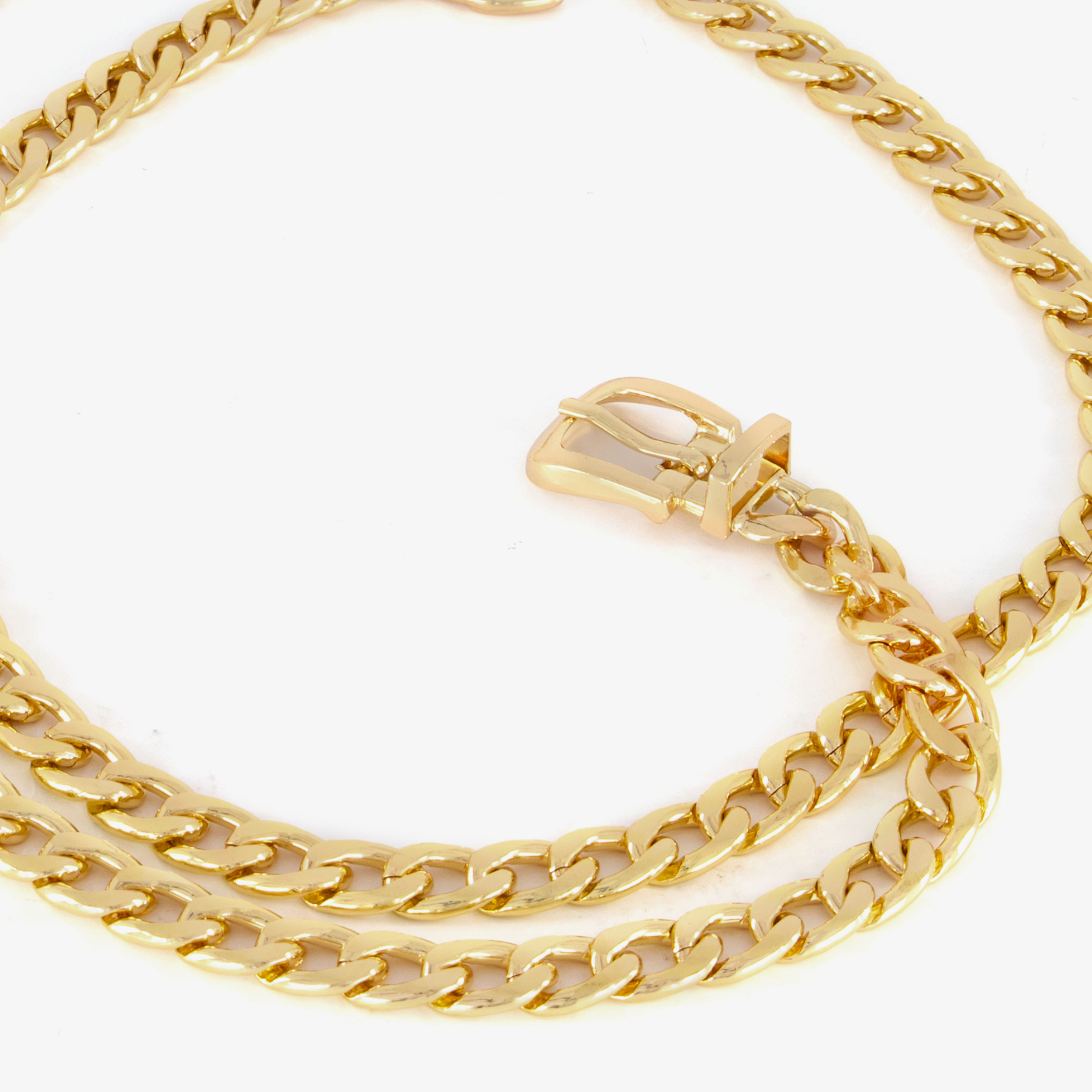 Goudkleurige kettingriem voor dames. De geschakelde riem heeft een gespsluiting.