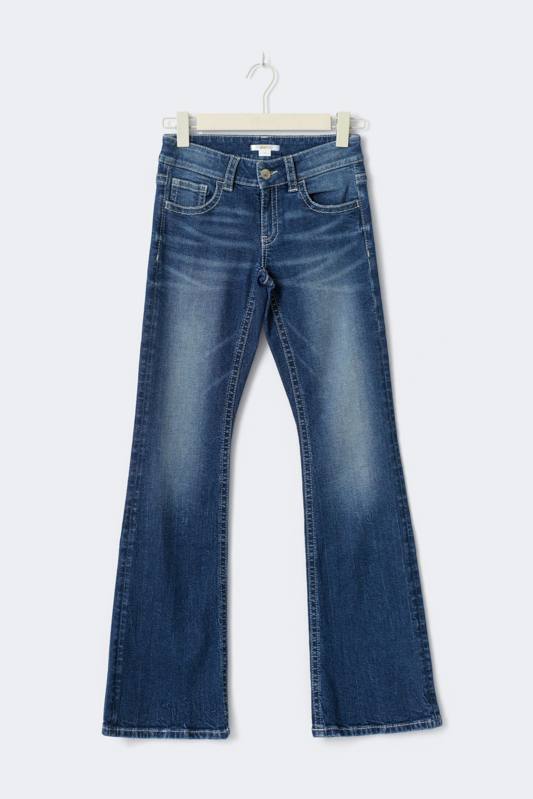 Tall flare jeans met lage taille. De spijkerbroek is blauw en heeft uitlopende pijpen. Het heeft lage stretch, verstelbare elastiek aan de taille, riemlussen, voorzakken, gulp en geborduurde achterzakken met flap en knop. Perfect voor personen die 175 cm (5 ft 9 in.) of groter zijn.