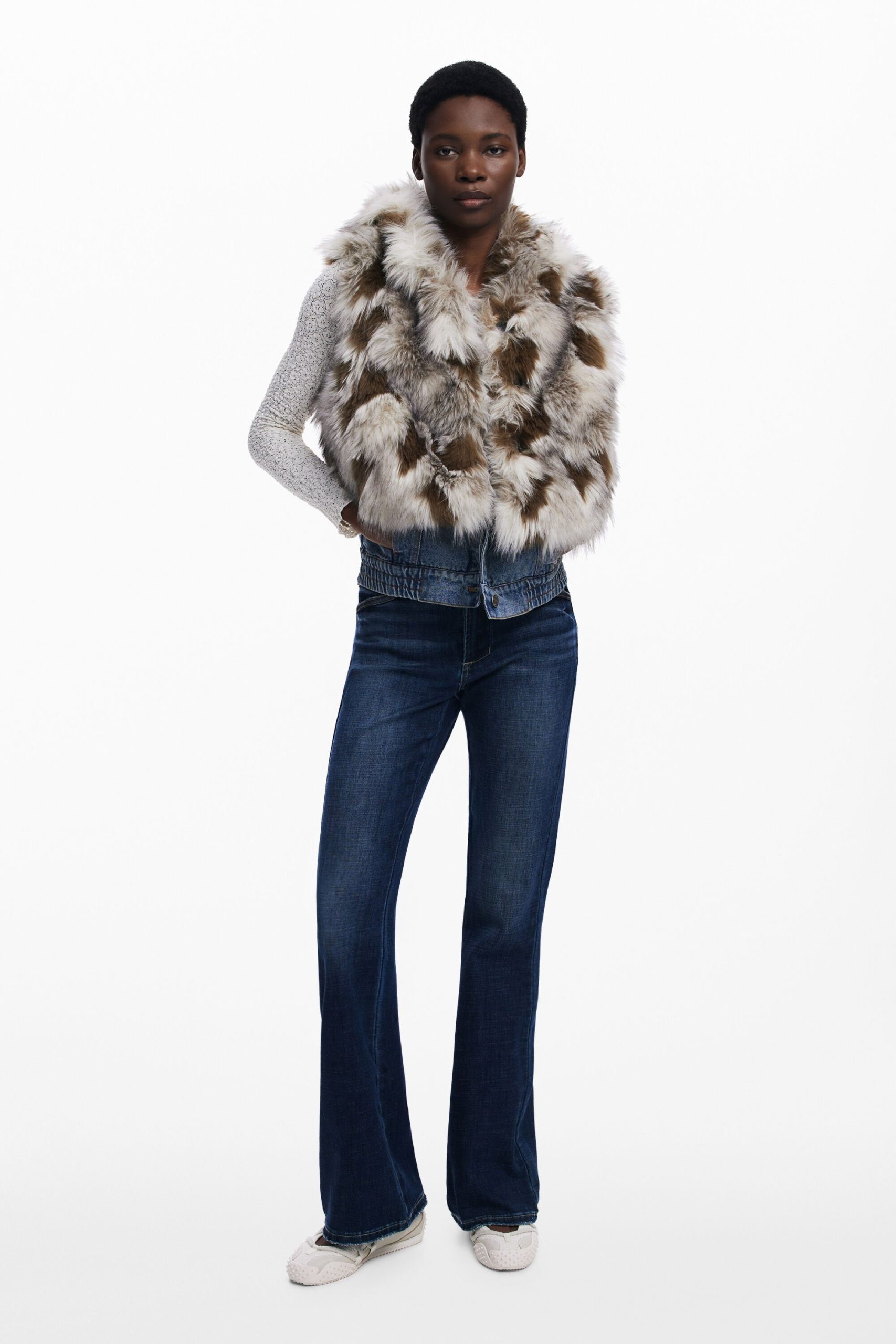 Trucker-achtig gilet van denim, met synthetisch bont, capuchon, voorzakken en elastische tailleband met leereffect afwerking aan de achterkant.
