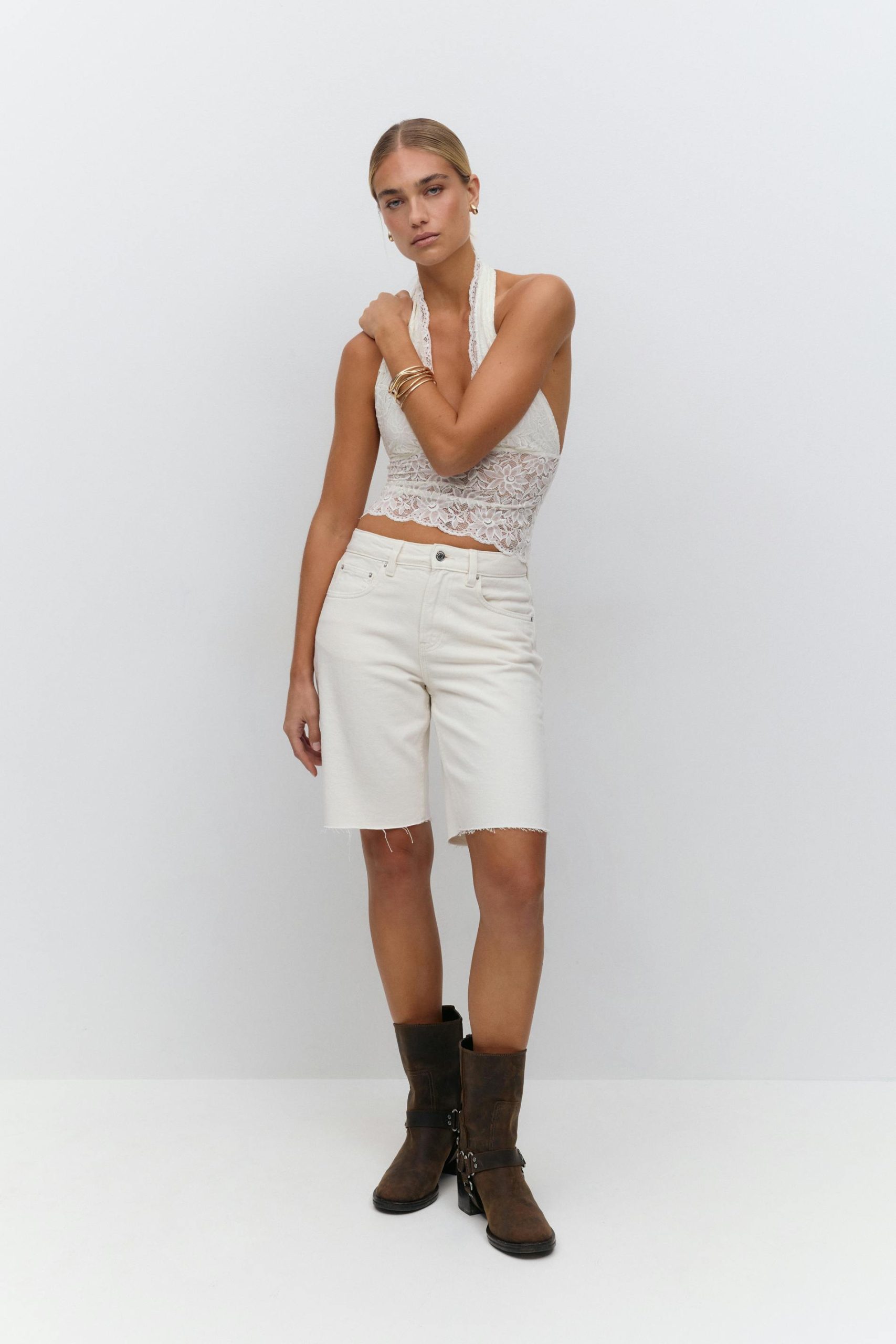 Lange jeansshort met een hoge taille. De short is wit en breed en heeft een baggy pasvorm. Het heeft een gulp, een vijf zakken ontwerp en een niet-elastisch materiaal.