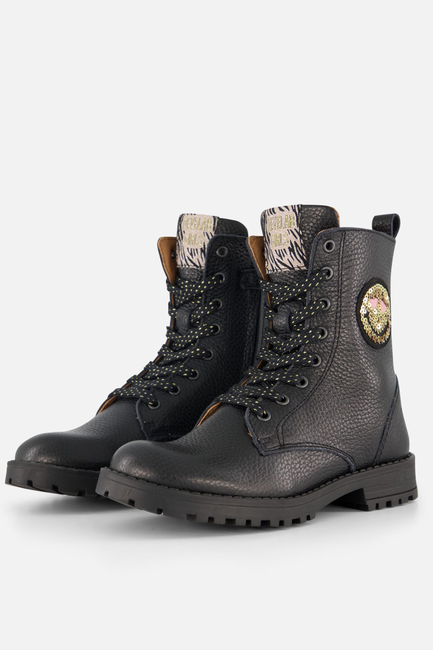 Deze stoere Develab veterboots zijn van leer, wat zorgt voor een soepele pasvorm en ademend vermogen. De boots hebben een speelse smiley aan de zijkant en een zebraprint op de tong. Dankzij de handige combinatie van rits en vetersluiting kunnen ze gemakkelijk aangepast worden voor een perfecte pasvorm.