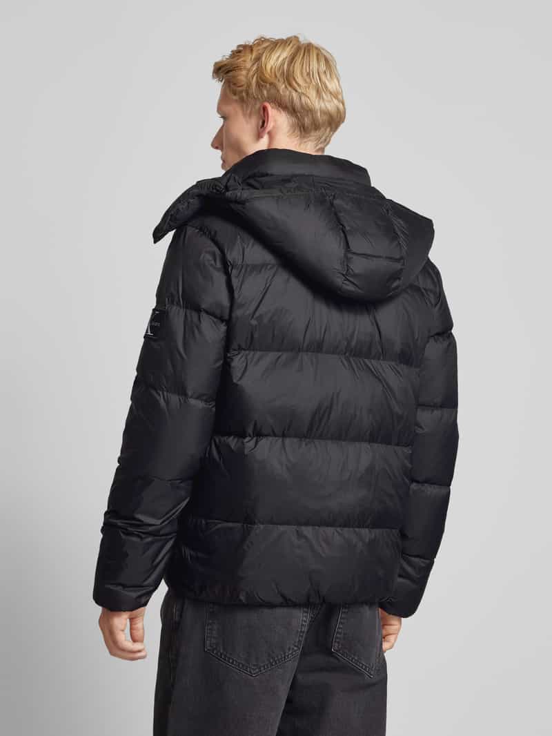 Donsjack van Calvin Klein Jeans voor heren;Dons- en verenvulling;Recht model;Model ‘ESSENTIALS’;Capuchon;Opstaande kraag met knoopsluiting;Deelbare ritssluiting;Logoprint;Ritszakken;Ruglengte bij maat M: 69 cm;Schouderbreedte bij maat M: 46 cm;Borstomvang bij maat M: 54 cm;Mouwlengte bij maat M: 68 cm