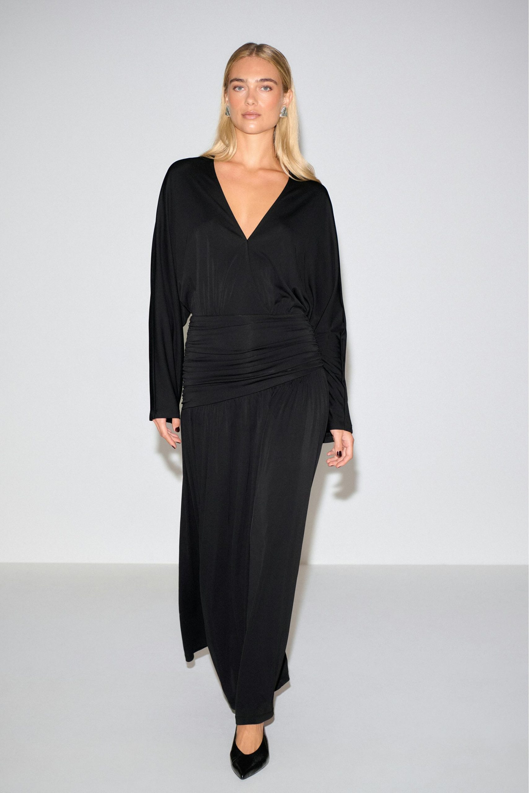 Maxijurk met een vergaard effect. De jurk is zwart en heeft een lange mouw. Het heeft een v-hals en een rek.
