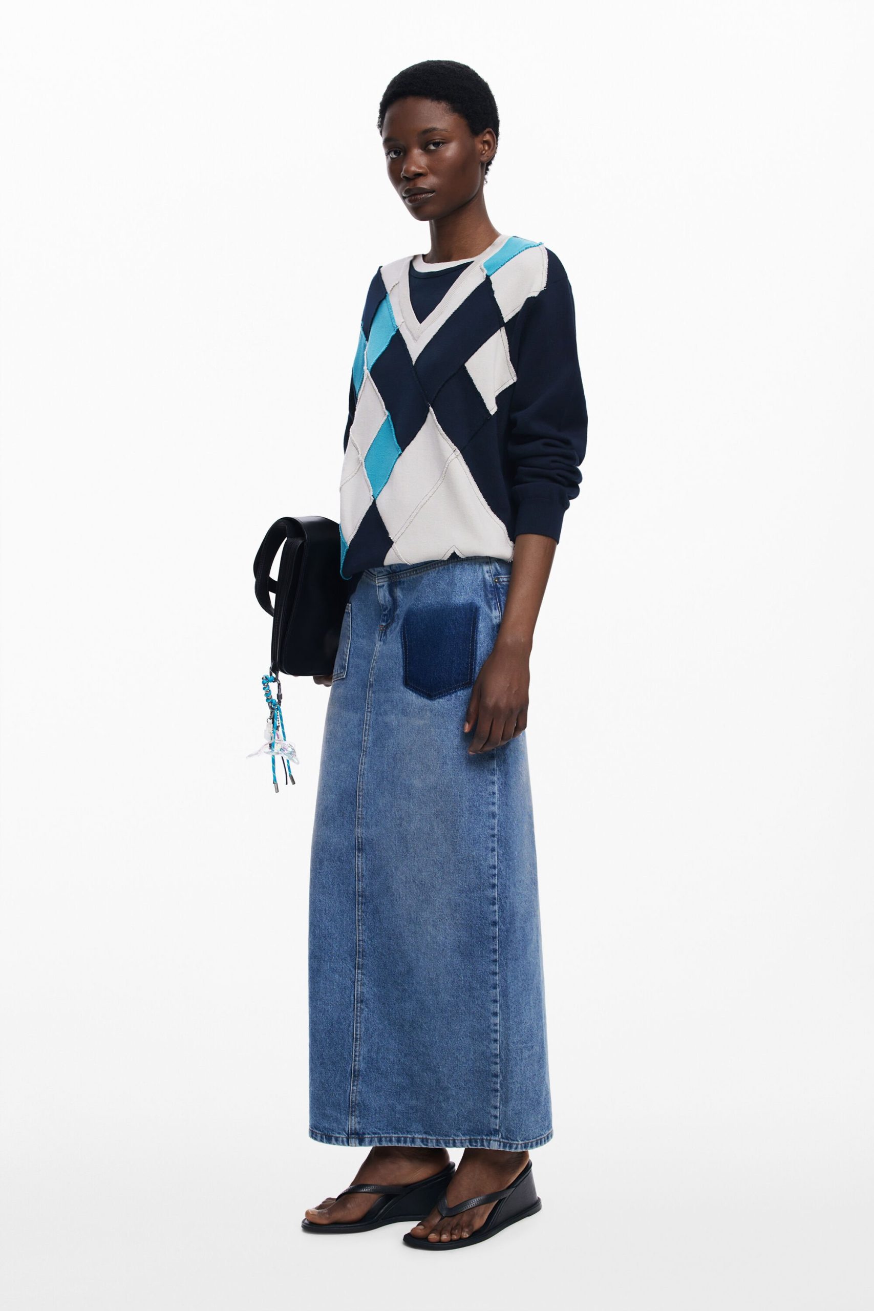 Fijngebreide trui van katoen, met dubbele ronde en V-hals, ontwerp van de print met ruitdetails langs de rand en geribde afwerkingen aan de manchetten en taille.