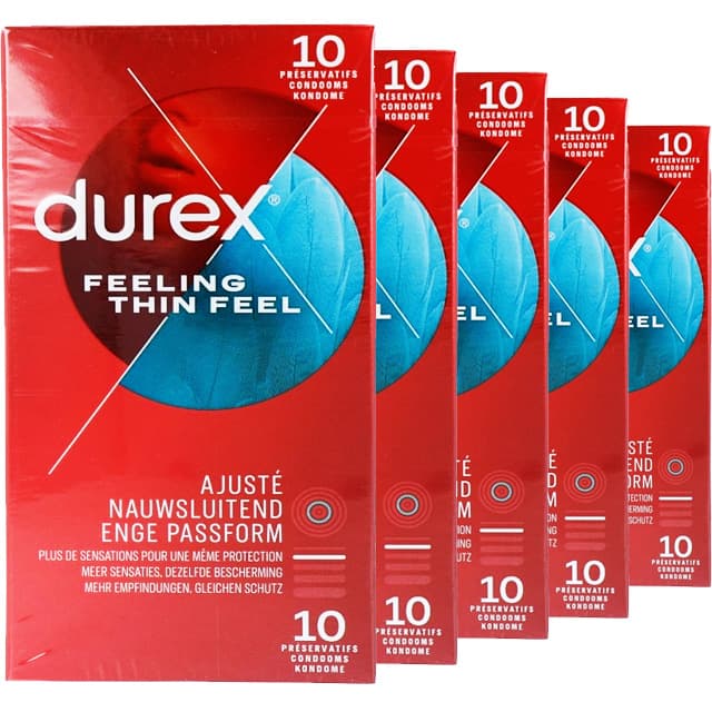 Durex Feeling Thin Feel Condooms staan bovenaan de voorkeurslijsten van veel heren in het hele land. Deze condooms zijn nauwsluitend en supercomfortabel en, zoals de naam al doet vermoeden, voel je je partner en geniet je van een bijna huid-op-huid contact. Geschikt voor mannen die een normaal condoom nodig hebben, ze zijn 52.5 mm breed en 180 mm lang. Met een dikte van slechts 0,05 mm behoren ze ook tot de dunste condooms op de markt. Door de extreem dunne latex voel je direct de warmte van je partner. Durex Feeling Thin Feel Condooms zijn gemaakt van natuurlijk rubberlatex en hebben een gemakkelijke vorm en voelen zeer comfortabel aan. Ze hebben een gladde textuur en zijn voorzien van glijmiddel. Durex Feeling Thin Feel Condooms zijn robuust en betrouwbaar en hebben geen latexsmaak of -geur. Het product is geschikt voor orale, vaginale en anale seks. Alle condooms van Durex zijn elektronisch getest op veiligheid en voldoen aan of overtreffen alle Europese normen. Elk Durex Feeling Thin Feel Condoom is individueel verpakt in een folieverpakking gemarkeerd met het CE