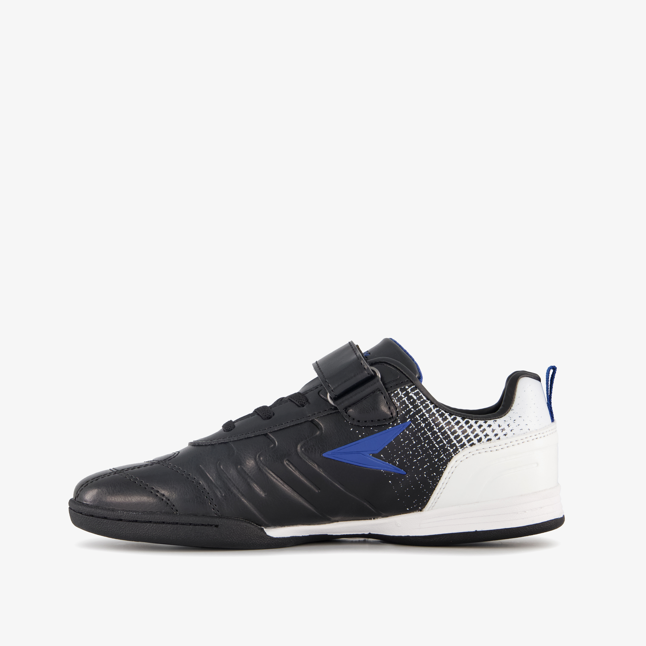 Zwart-witte zaalvoetbalschoenen voor kinderen van Dutchy. Het buitenwerk is gemaakt van imitatieleer, het binnenwerk van textiel en de non-marking profielzool is van rubber. De binnenzool is gemaakt van textiel en is uitneembaar. Voorzien van elastische veters en een klittenbandsluiting voor een goede pasvorm en hiellusjes voor een makkelijke instap. De zaalschoenen hebben blauwe accenten en merkopdrukken op het bovenwerk.