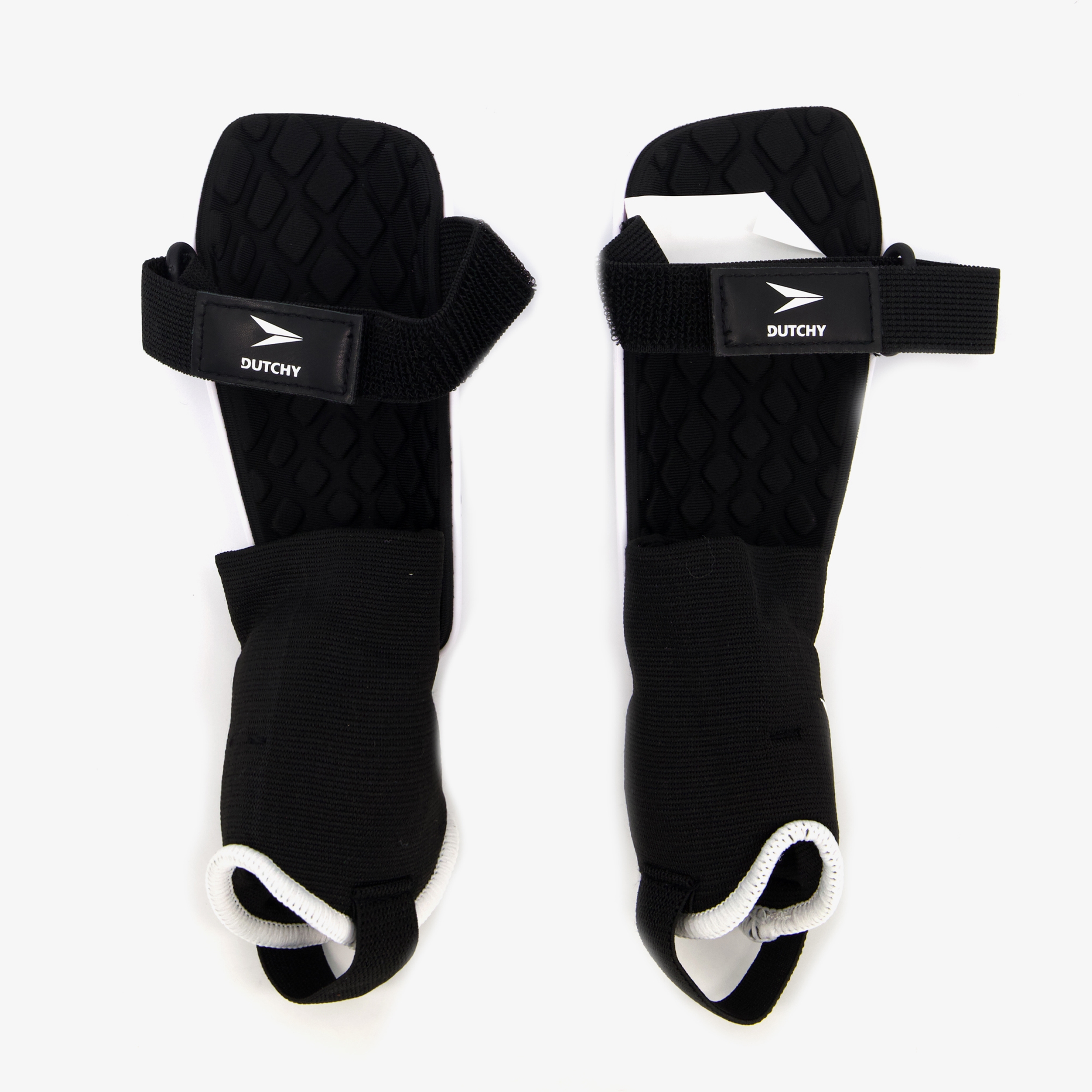 Wit/zwarte scheenbeschermers van Dutchy. De scheenbeschermers zijn anatomisch gevormd en blijven dankzij de enkelsokken extra goed zitten. Met de klittenbandsluiting stel je de scheenbeschermers op maat af. Voorzien van EVA-voering die schokken dempt en scheenbeschermers waardoor je niet meer bang hoeft te zijn voor schoppen tijdens je wedstrijd. Maatvoering: XS = 155 CM.