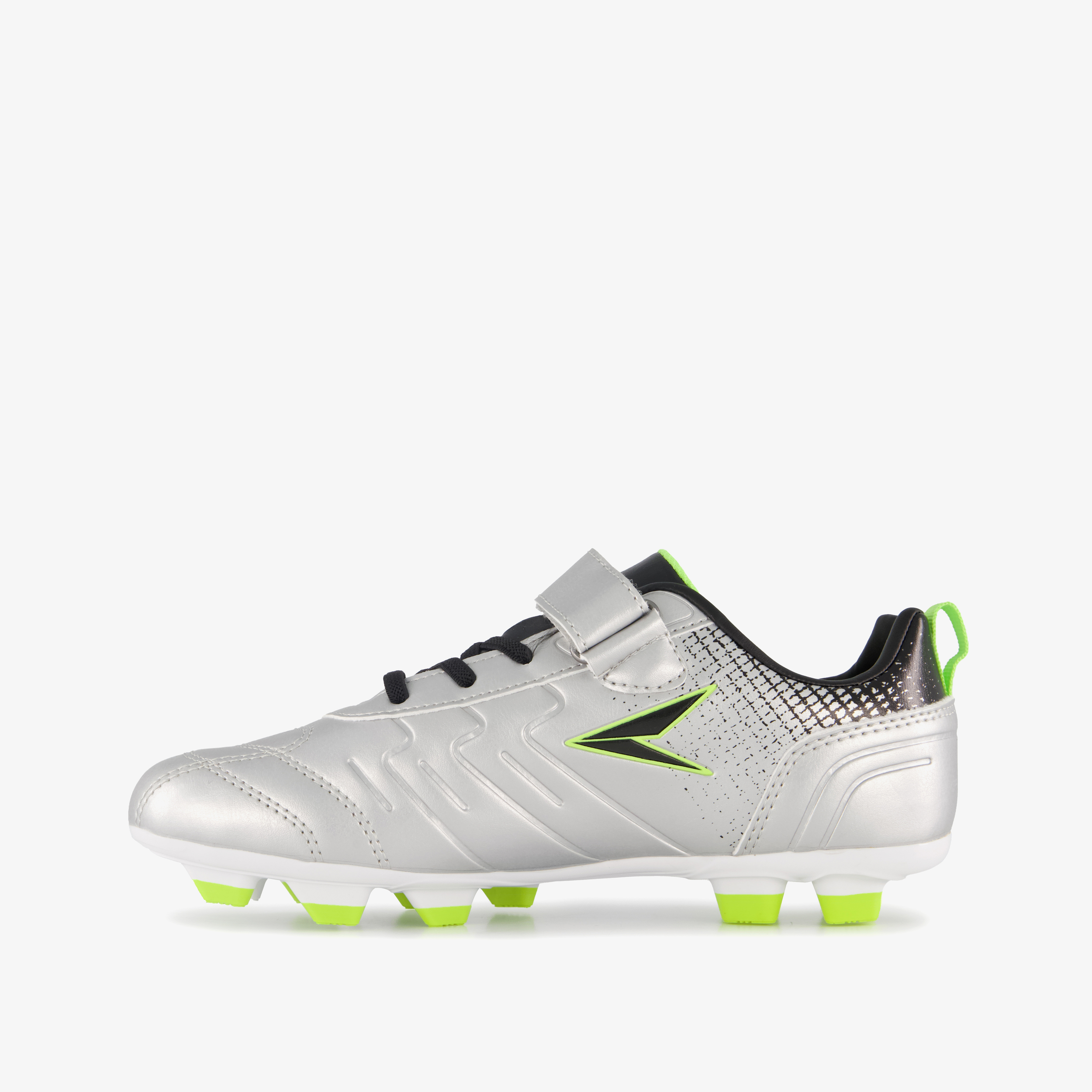 Zilverkleurige Dutchy Top-Spin voetbalschoenen voor kinderen. Het buiten- en binnenwerk zijn gemaakt van imitatieleer en de Firm Ground zool is van rubber. De FG zool geeft je grip op het veld en is geschikt voor natuurgras. De binnenzool is gemaakt van textiel en is uitneembaar. Voorzien van elastische veters en een klittenbandsluiting voor een optimale pasvorm en hiellusjes voor een makkelijke instap. De voetbalschoenen hebben zwarte en groene details.