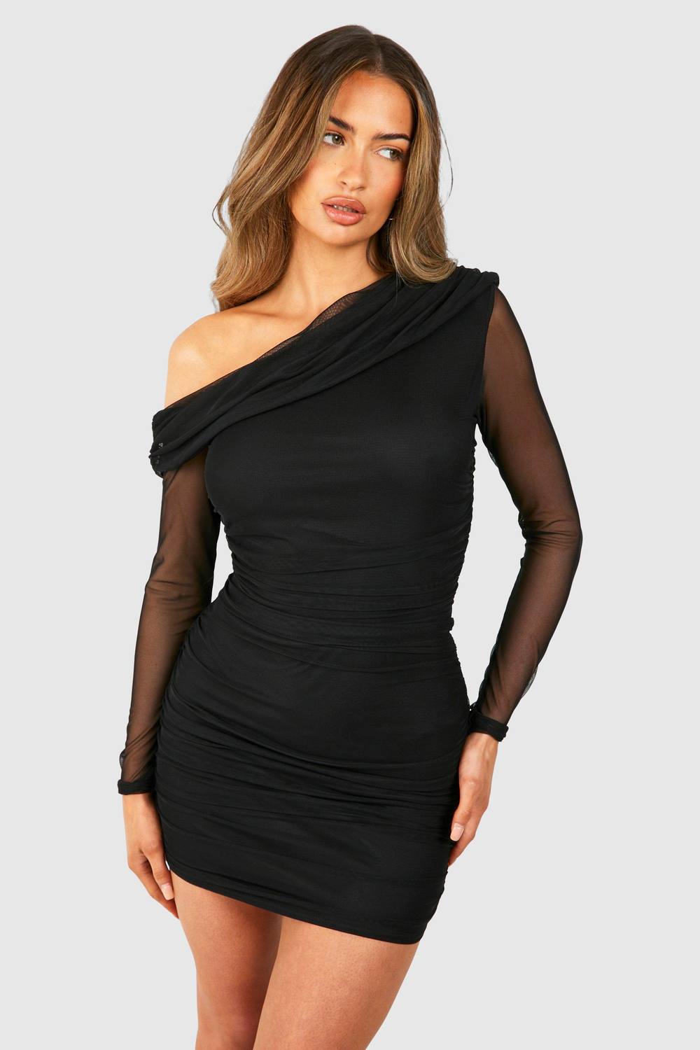 Éénschouder geruched mesh mini-jurk met lange mouwen