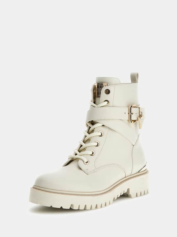 Enkellaarsje boot van kunstleer.Ronde punt.Hoogte hak 4 cm.Sluiting met veters, gesp en rits in de zijkant.Charm driehoeklogo.Gelamineerd detail op de achterkant.Samenstelling bovendeel: 100% Polyurethaan.Binnenzool en binnenvoering van kunstleer.Zool van thermoplastisch rubber.Hoogte schacht: 16 cm.Omtrek schacht: 24 cm.