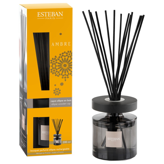 Een goed huisparfum is aangenaam en draagt bij aan de gemoedstoestand. Nog fijner is het wanneer de geurverspreider een strak uiterlijk heeft en goed in het interieur past. De Ellipse geurdiffuser van Esteban heeft een eigentijdse moderne look en een opvallende cirkelvormige houten dop die het geheel een warme uitstraling geeft. De set bestaat uit een glazen antracietkleurig flesje, zwarte geurstokjes en 200 ml huisparfum. Uiteraard kunt u metéén van de vele navullingen zelf bepalen welke geur u wenst te gebruiken. Afhankelijk van de hoeveelheid geurstokjes die u in de vloeistof plaatst, kan de intensiteit van de geur naar wens worden aangepast en blijven de stokjes 1 -2 maanden hun geur verspreiden. Voor een optimale geurbeleving raden wij aan de Esteban geurstokjes iedere 4-5 dagen om te draaien.Geur: AmbreEen subtiele ambergeur met een citrusaccent en vanille, houtachtige nuances. Ergens in het Oosten gaat de zon op in de sterren. De ingrediënten zijn kostbaar, het parfum magisch, sensueel en onweerstaanbaar.Topnoten: Bergamot en citroenHartnoten: Patchouli en sandelhoutBasisnoten: Amber en vanille