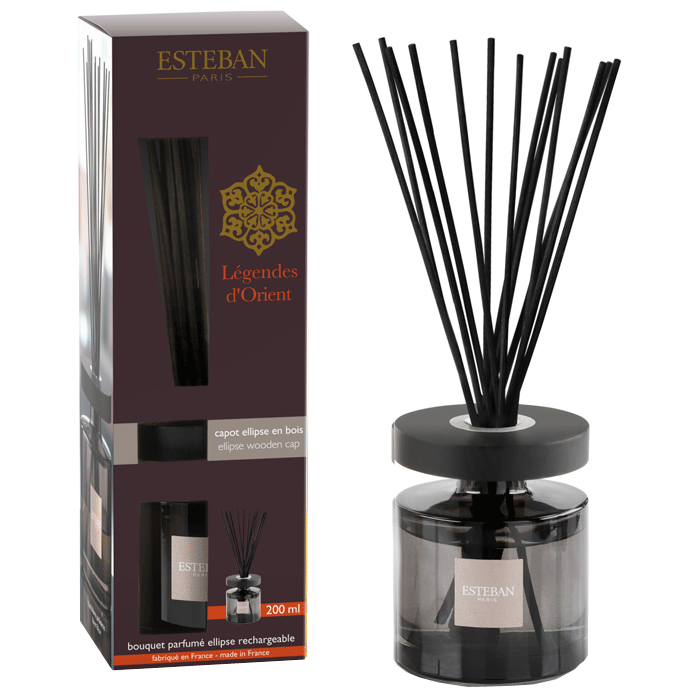 Een goed huisparfum is aangenaam en draagt bij aan de gemoedstoestand. Nog fijner is het wanneer de geurverspreider een strak uiterlijk heeft en goed in het interieur past. De Ellipse geurdiffuser van Esteban heeft een eigentijdse moderne look en een opvallende cirkelvormige houten dop die het geheel een warme uitstraling geeft. De set bestaat uit een donkergrijs glazen flesje, zwarte geurstokjes en 200 ml huisparfum. Uiteraard kunt u metéén van de vele navullingen zelf bepalen welke geur u wenst te gebruiken. Afhankelijk van de hoeveelheid geurstokjes die u in de vloeistof plaatst, kan de intensiteit van de geur naar wens worden aangepast en blijven de stokjes 1-2 maanden hun geur verspreiden. Voor een optimale geurbeleving radenwij aan de Esteban geurstokjes iedere 4-5 dagen om te draaien.Geur: Légendes d’OrientEen rijke geur van hout, warme kruiden en sensuele bloemen. Deze comfortabele geur neemt je mee op reis naar het Verre Oosten, waar de zon zich vermengt met de sterren aan de poorten van de woestijn, in het gouden licht van een legendarische stad, waar rijke karavanen hun afdrukken hebben achtergelaten. Het is een magische mix van kostbare materialen, kruiden en zijde die de mysterieuze paleizen van de aloude koningen voor altijd verfraaien.Topnoten: Mandarijn, kruidnagel en foelieHartnoten: Jasmijn, gardenia en patchouliBasisnoten: Sandelhout, musk en tonka