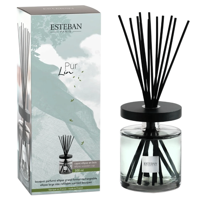 Een goed huisparfum is aangenaam en draagt bij aan de gemoedstoestand. Nog fijner is het wanneer de geurverspreider een strak uiterlijk heeft en goed in het interieur past. De Ellipse XL geurdiffuser van Esteban heeft een eigentijdse moderne look en een opvallende cirkelvormige houten dop die het geheel een warme uitstraling geeft. De set bestaat uit een glazen antracietkleurig flesje, zwarte geurstokjes en 500 ml huisparfum. Uiteraard kunt u metéén van de vele navullingen zelf bepalen welke geur u wenst te gebruiken. Afhankelijk van de hoeveelheid geurstokjes die u in de vloeistof plaatst, kan de intensiteit van de geur naar wens worden aangepast en blijven de stokjes 5-6 maanden hun geur verspreiden. Voor een optimale geurbeleving radenwij aan de Esteban geurstokjes iedere 4-5 dagen om te draaien.Geur: Pur LinEen natuurlijke, oneindig frisse geur die uitnodigt tot kalmte en sereniteit. Een lichte bries en een linnen doek die golft door de lucht vol pluizige wolken. Jouw huis wordt een toevluchtsoord van welzijn.Topnoten: Scharlei en ho-houtHartnoten: Rosoflor en witte muskBasisnoten: Vanille en sandelhout