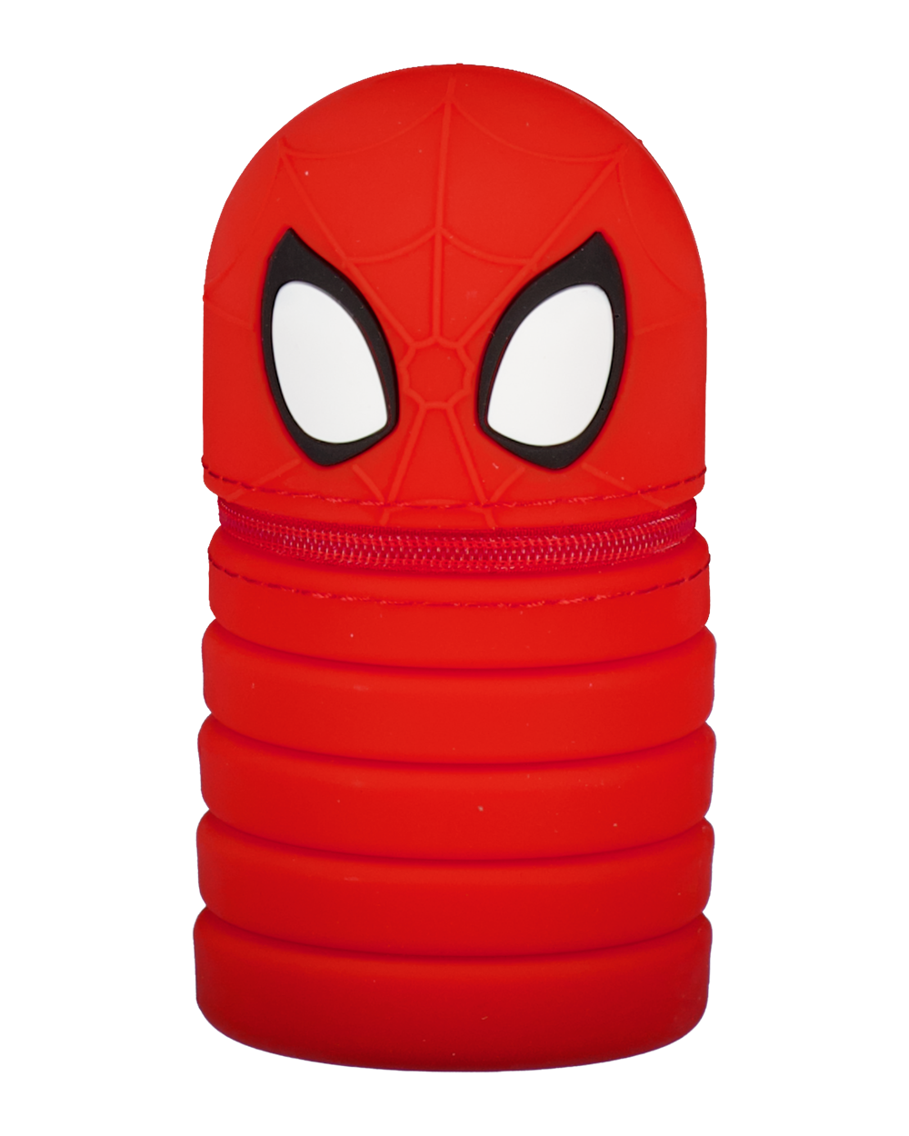 Deze etui is gemaakt van siliconen en metaal en heeft een opvallend rood ontwerp met een patroon dat doet denken aan een stripfiguurgezicht. De etui sluit met een rits in het midden en is voorzien van duidelijke, witte ogen aan de bovenzijde. Door het stevige en flexibele materiaal is deze etui geschikt om bijvoorbeeld pennen, potloden of kleine kantoorartikelen in op te bergen en te beschermen.