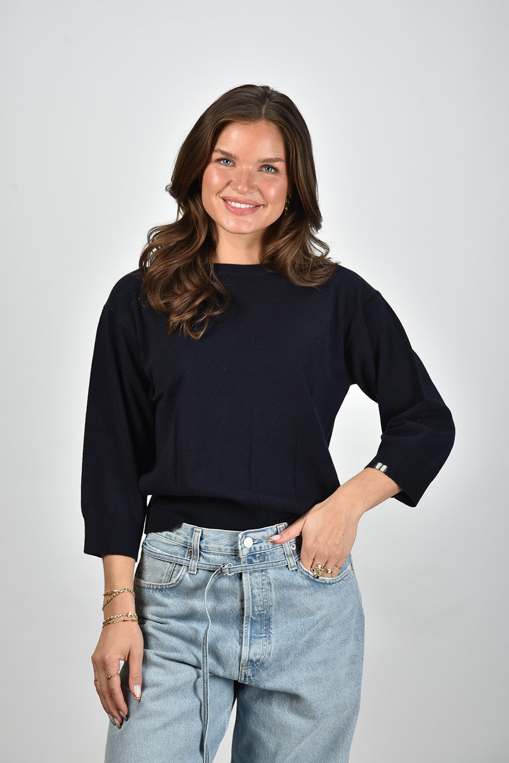 Zie hier de Extreme Cashmere trui Jewel in navy, vervaardigd uit 100% kasjmier. Dit kledingstuk biedt een normale pasvorm en is ontworpen voor ultiem comfort. Perfect te combineren met diverse stijlen dankzij zijn veelzijdige ontwerp. Model Lise draagt maat M bij een lengte van 1,73m. Artikelnummer: 398-001-01-TU-01-Navy.