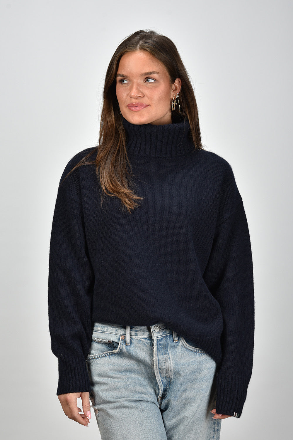 Prachtige trui van Extreme Cashmere, model Oversize Xtra, in de kleur navy. Deze trui combineert elegantie en ultiem comfort. Doordat deze trui van cashmere is, is hij heerlijk warm voor de koudere dagen. Deze trui is voorzien van lange mouwen en een col. Combineer deze trui met andere items van Extreme Cashmere of draag deze trui op een jeans. Deze trui heeft een normale pasvorm. Model is 1,75m, heeft maat S en draagt maat One Size.