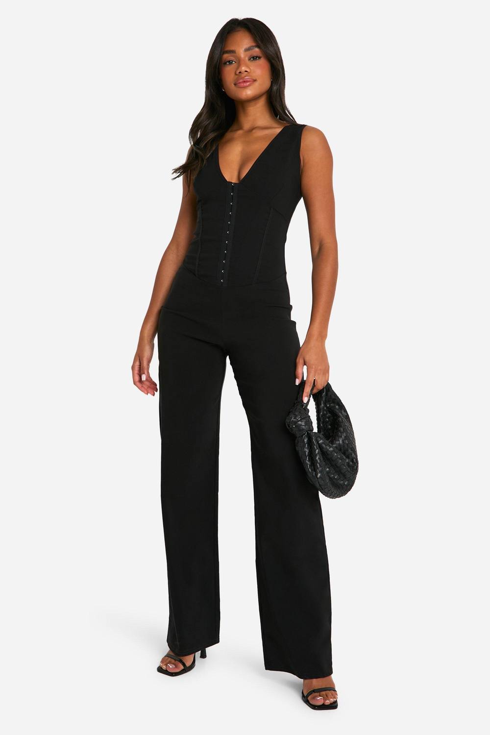 Indrukwekkend korset-achtig bovenstuk met haak-en-oog sluiting aan de voorkant Diep uitgesneden halslijn voor een gedurfde uitstraling Strak silhouet met wijde pijpen voor een moderne touch Flatterende getailleerde taille om je figuur te accentueren Veelzijdige bengalinestof die comfort en stijl biedt Val op in deze opvallende jumpsuit met korsetlook van Boohoo. Perfect voor die avonden uit wanneer je de aandacht wilt trekken, combineert dit stuk verfijning met een gedurfde uitstraling. Het door een korset geinspireerde bovenstuk creeert een verbluffend silhouet, terwijl de wijde pijpen een eigentijdse twist geven. Style het met bandjeshakken en een clutch voor een avond in de club, of draag het casual met sneakers en een leren jasje voor een borrel met vrienden. De diep uitgesneden halslijn voegt een vleugje allure toe, waardoor het ideaal is voor wie indruk wil maken. Of je nu de hele nacht danst of geniet van cocktails in een rooftopbar, deze jumpsuit wordt zeker jouw favoriet voor stedelijke nachtlevenavonturen. boohoo Dames Eyelet Korset Jumpsuit | Black | Maat: 36